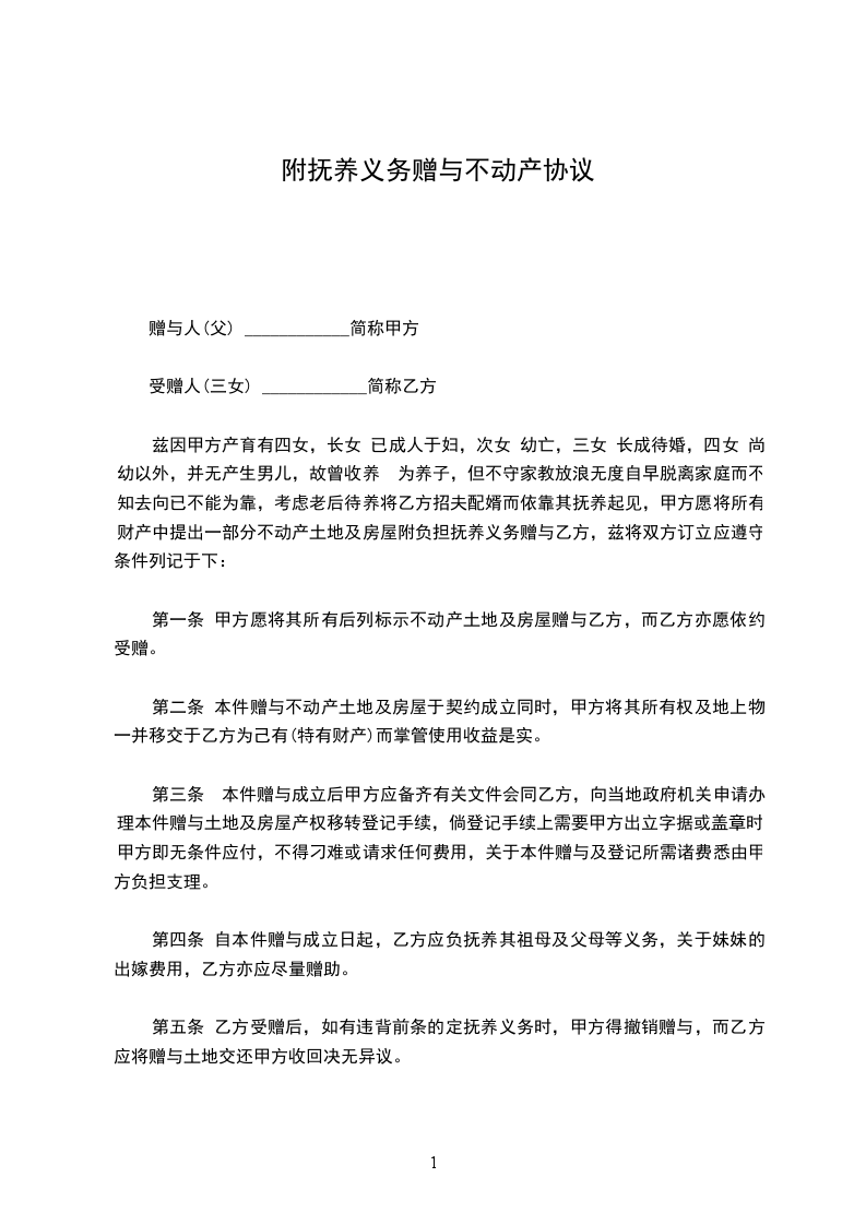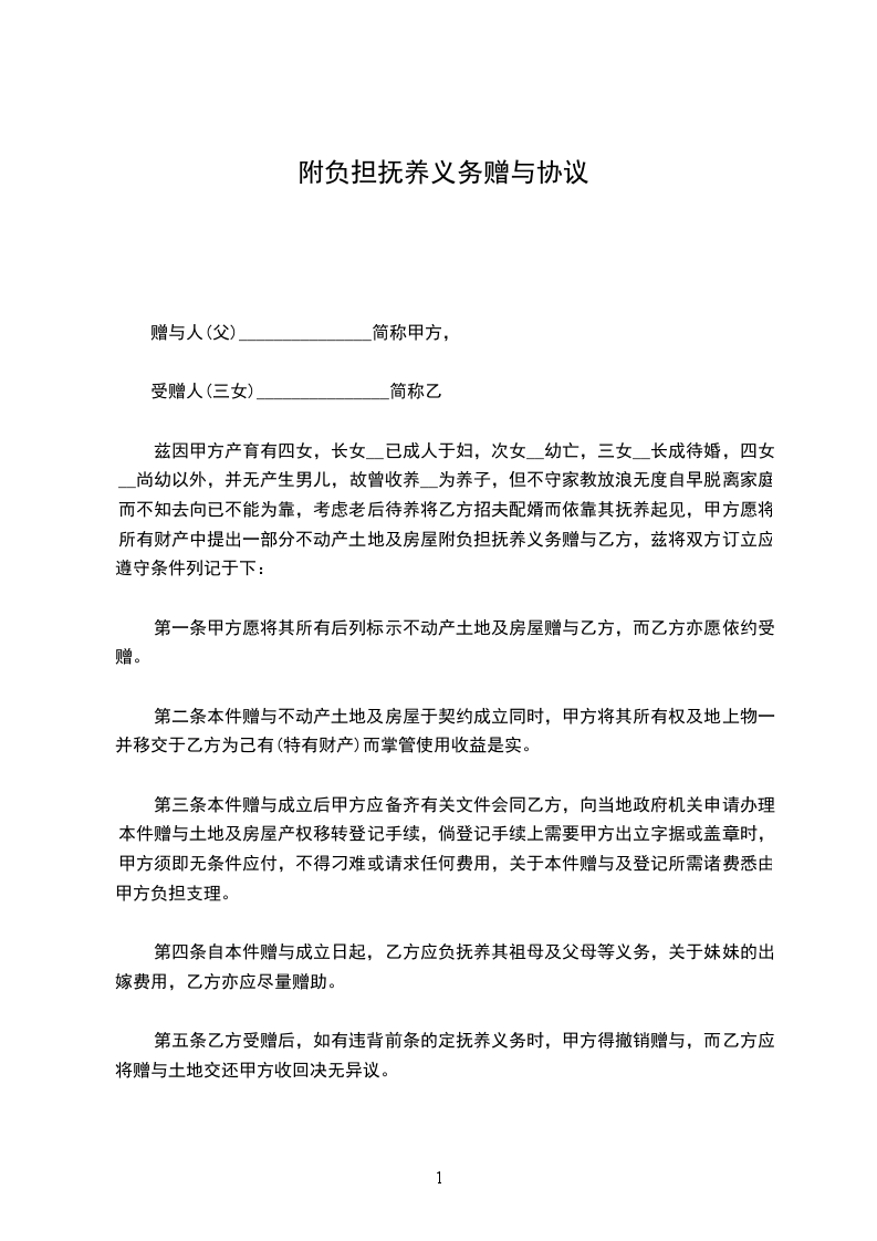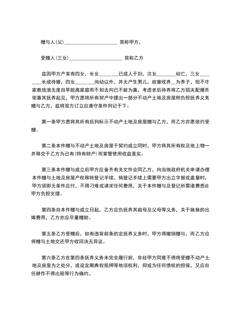 兹因甲方产育有四女,长女 已成人于妇,次女 幼亡,三女 长成待婚,四女 尚幼以外,并无产生男儿,故曾收养 为养子,但不守家教放浪无度自早脱离家庭而不知去向已不能为靠,考虑老后待养将乙方招夫配婿而依靠其抚养起见,甲方愿将所有财产中提出一部分不动产土地及房屋附负担抚养义务赠与乙方,兹将双方订立应遵守条件列记于下: