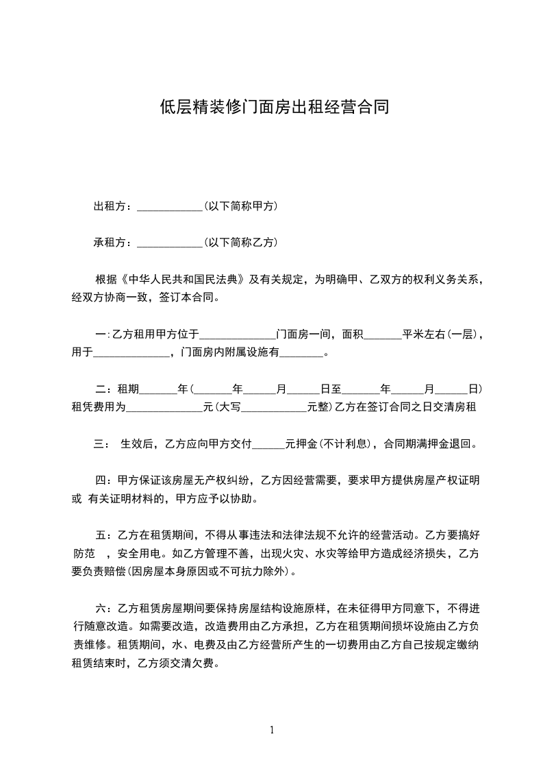 一:乙方租用甲方位于______________门面房一间,面积_______平米左右(一层),用于______________,门面房内附属设施有________。