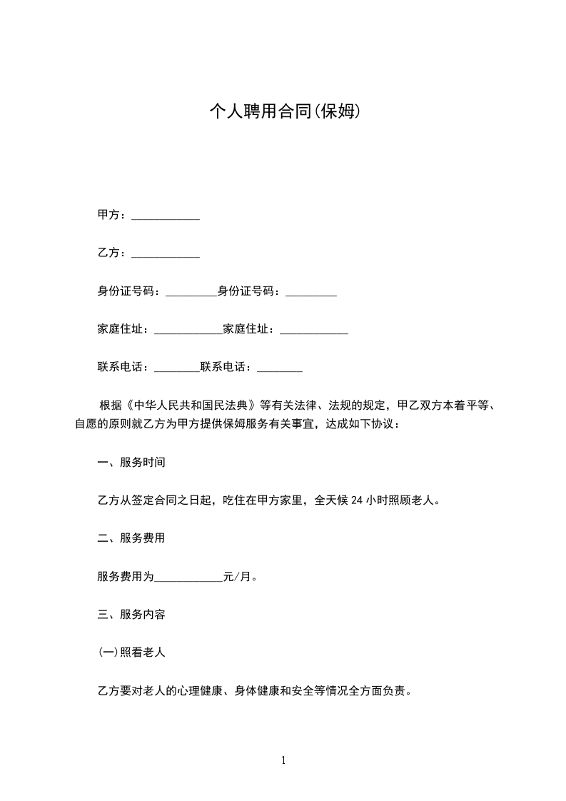 根据公平、公正、平等、自愿的原则,就甲方聘用乙方(保姆)工作达成如下协议:_______