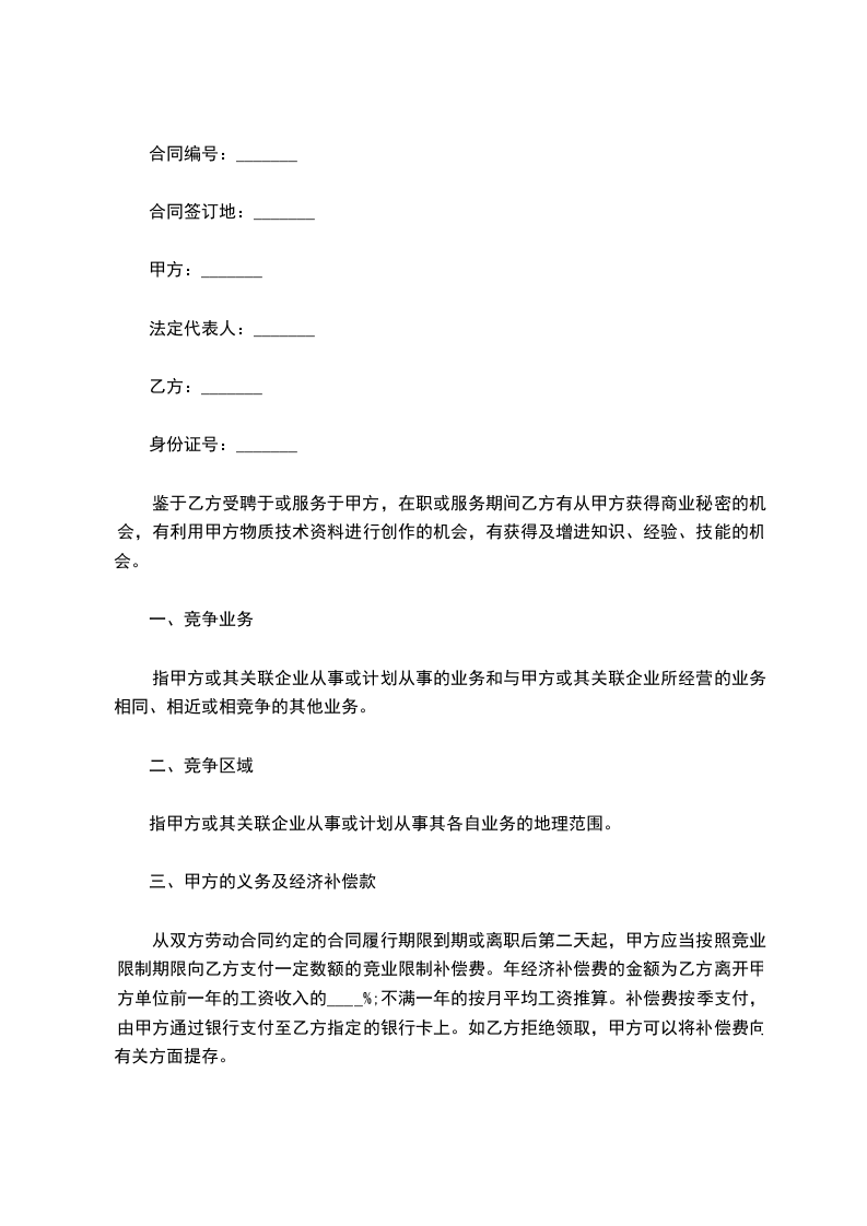 从双方劳动合同约定的合同履行期限到期或离职后第二天起,甲方应当按照竞业限制期限向乙方支付一定数额的竞业限制补偿费。年经济补偿费的金额为乙方离开甲方单位前一年的工资收入的____%;不满一年的按月平均工资推算。补偿费按季支付,由甲方通过银行支付至乙方指定的银行卡上。如乙方拒绝领取,甲方可以将补偿费向有关方面提存。