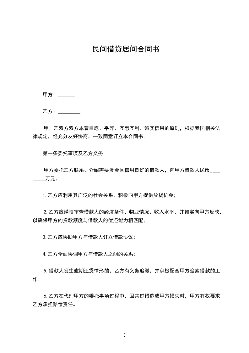 一、甲方委托乙方向银行联系和安排约_______万元人民币的借款(具体借贷金额由银行评估审批后确定),用于经营开发及消费或装修,乙方接受委托。