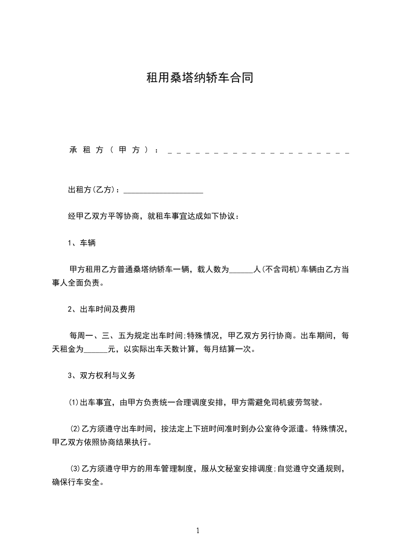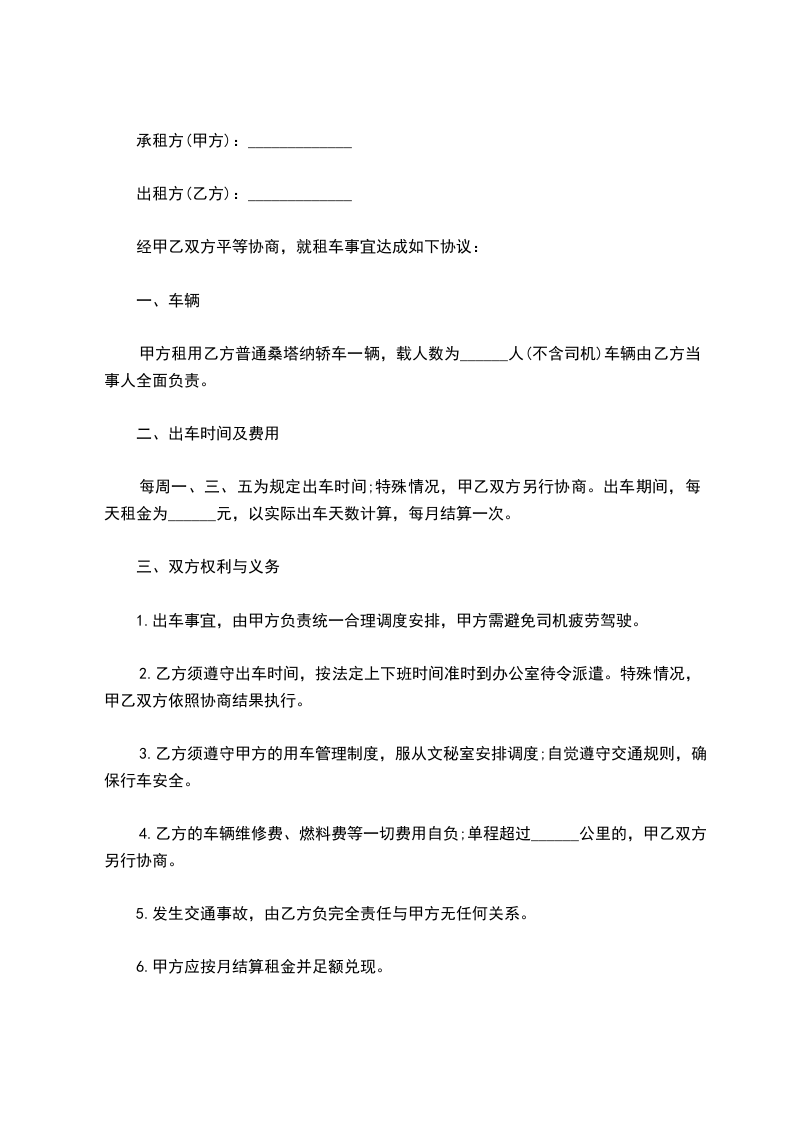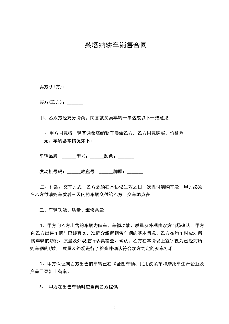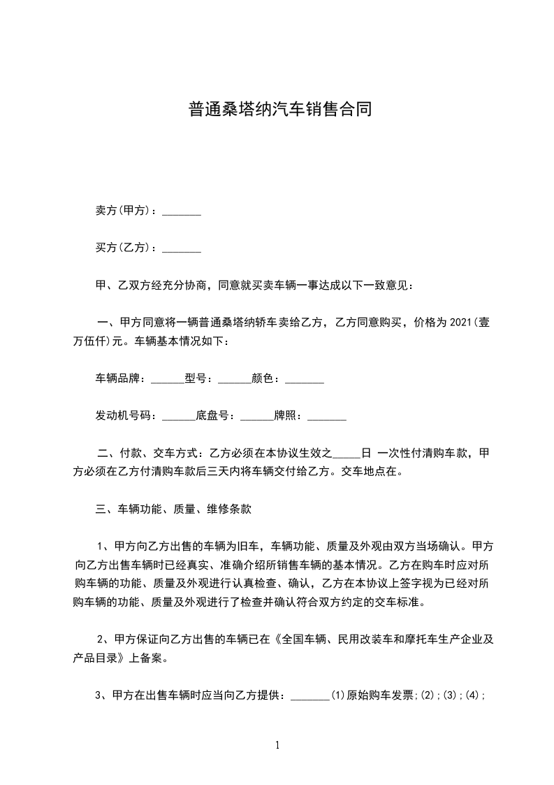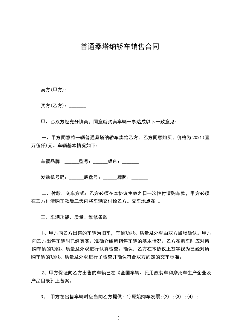 一、甲方同意将一辆普通桑塔纳轿车卖给乙方,乙方同意购买,价格为______________元。车辆基本情况如下: