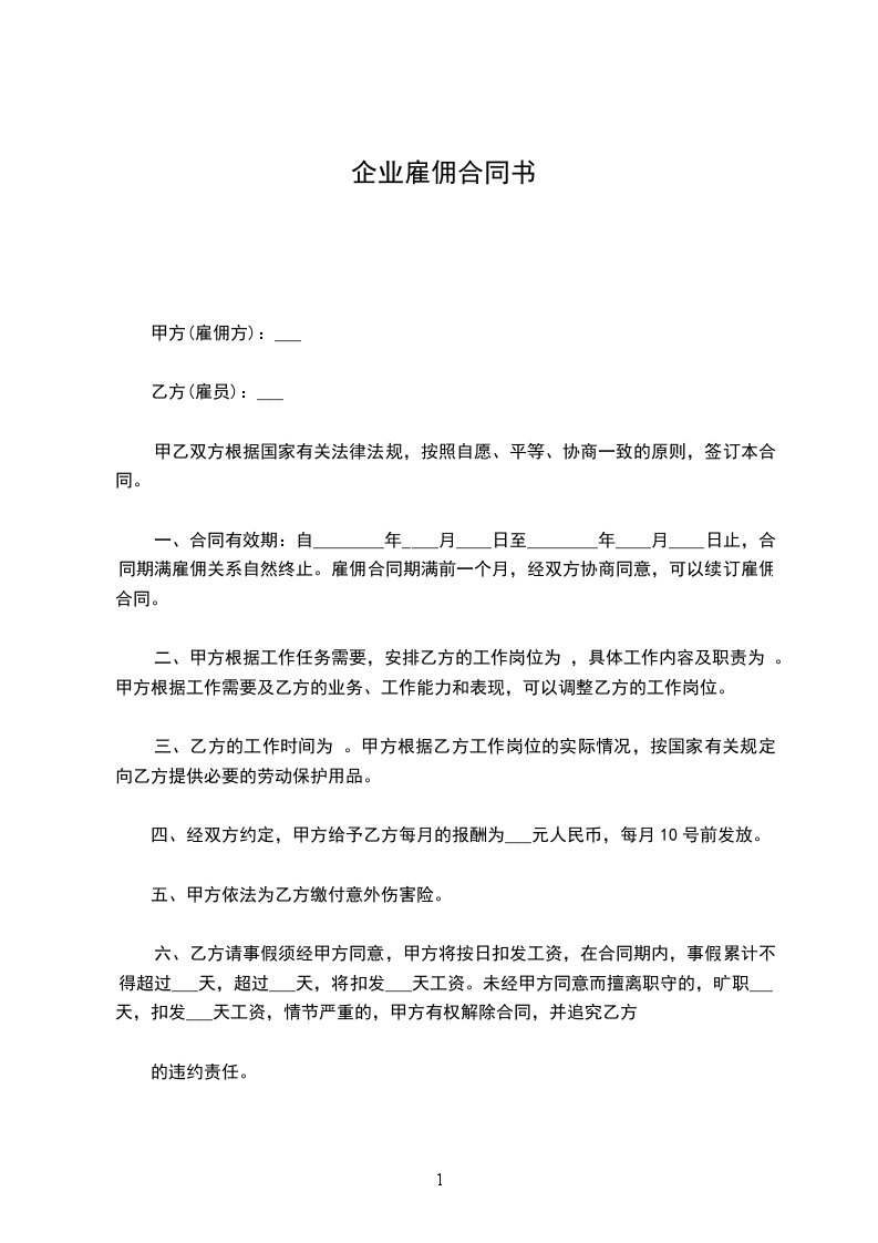 一、合同有效期:自________年____月____日至________年____月____日止,合同期满雇佣关系自然终止。雇佣合同期满前一个月,经双方协商同意,可以续订雇佣合同。