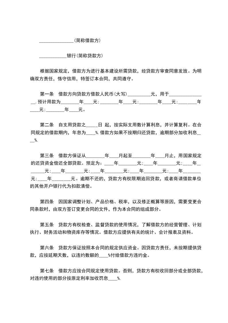 根据国家规定,借款方为进行基本建设所需贷款,经贷款方审查同意发放。为明确双方责任,恪守信用,特签订本合同,共同遵守。