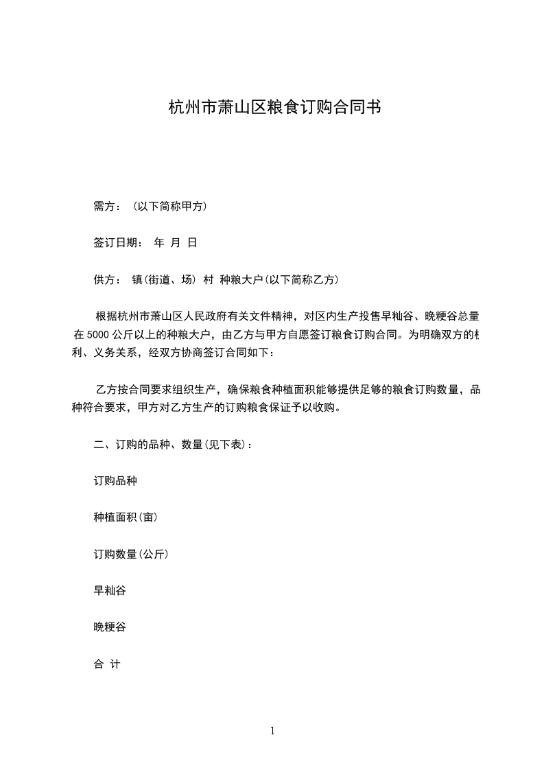 根据杭州市人民政府有关文件精神,对区内生产投售早籼谷、晚粳谷总量在5000公斤以上的种粮大户,由乙方与甲方自愿签订粮食订购合同。为明确双方的权利、义务关系,经双方协商签订合同如下:
