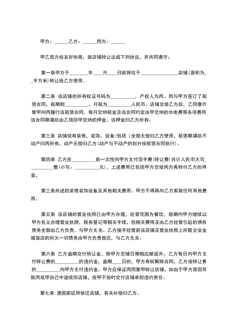 第二条 该店铺的所有权证号码为__________,产权人为丙。丙与甲方签订了租赁合同,租期到__________,月租为__________人民币。店铺交给乙方后,乙同意代替甲向丙履行该租赁合同,每月交纳租金及该合同约定由甲交纳的水电费等各项费用,该合同期满后由乙领回甲交纳的押金,该押金归乙方所有。