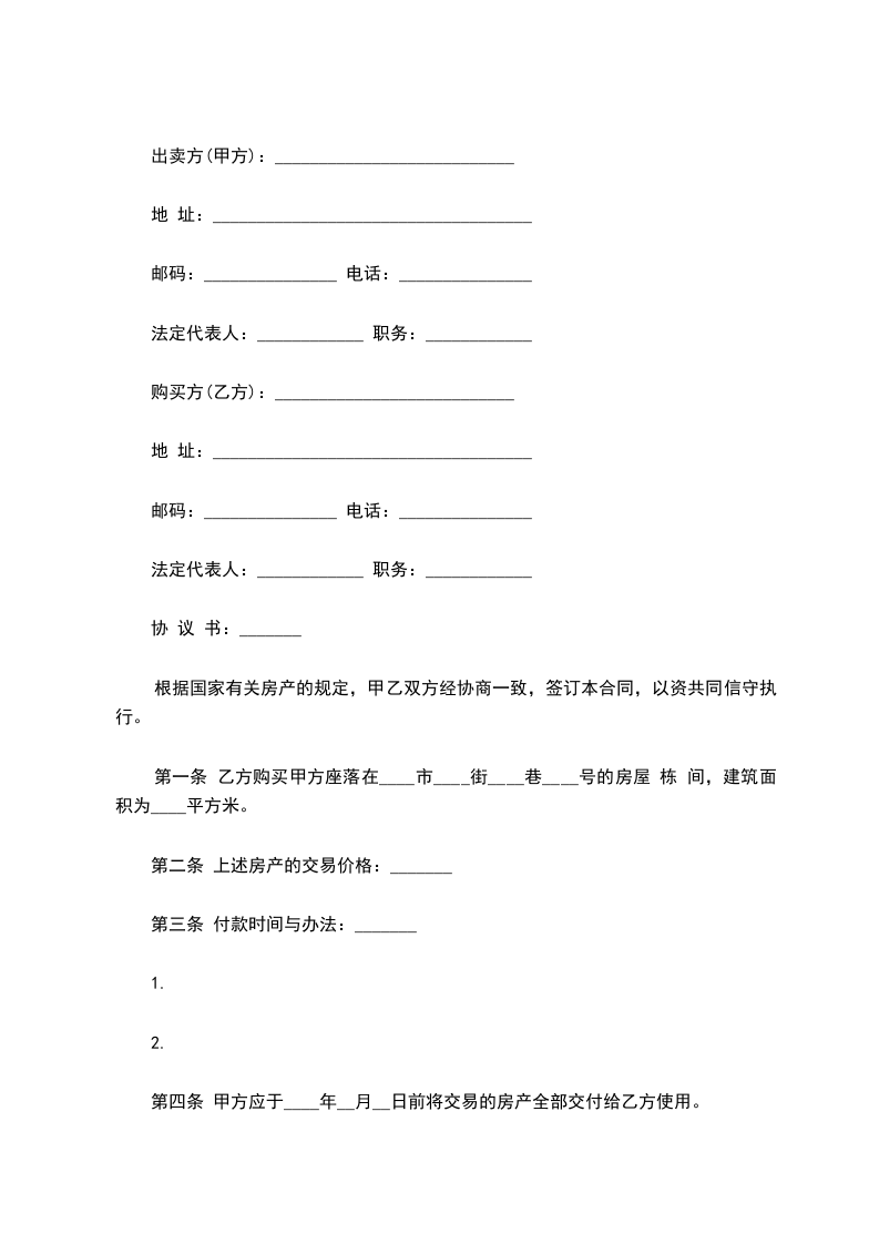 第一条 乙方购买甲方座落在____市____街____巷____号的房屋 栋 间,建筑面积为____平方米。