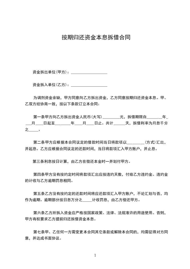 为调剂资金余缺,甲方同意向乙方拆出资金,乙方同意按期归还资金本息。甲、乙双方经协商一致,按以下条款订立本合同:_______