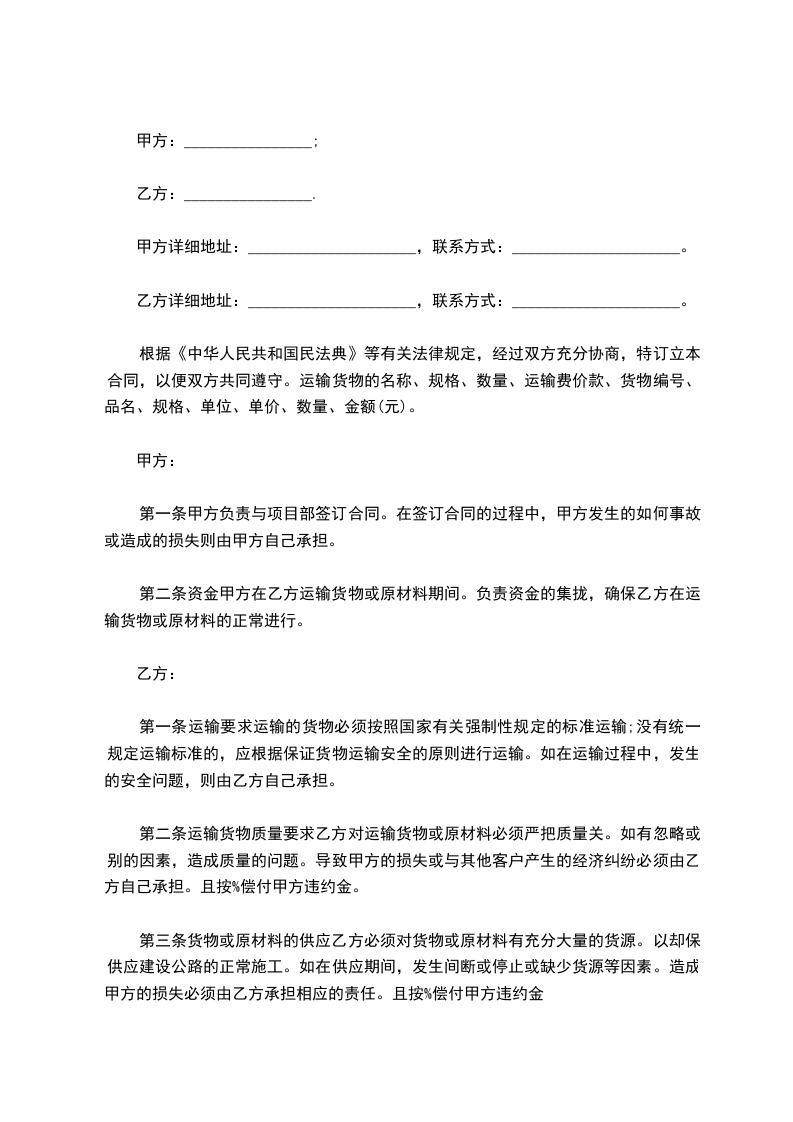 根据《中华人民共和国民法典》等有关法律规定,经过双方充分协商,特订立本合同,以便双方共同遵守。运输货物的名称、规格、数量、运输费价款、货物编号、品名、规格、单位、单价、数量、金额(元)。