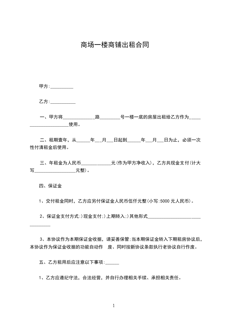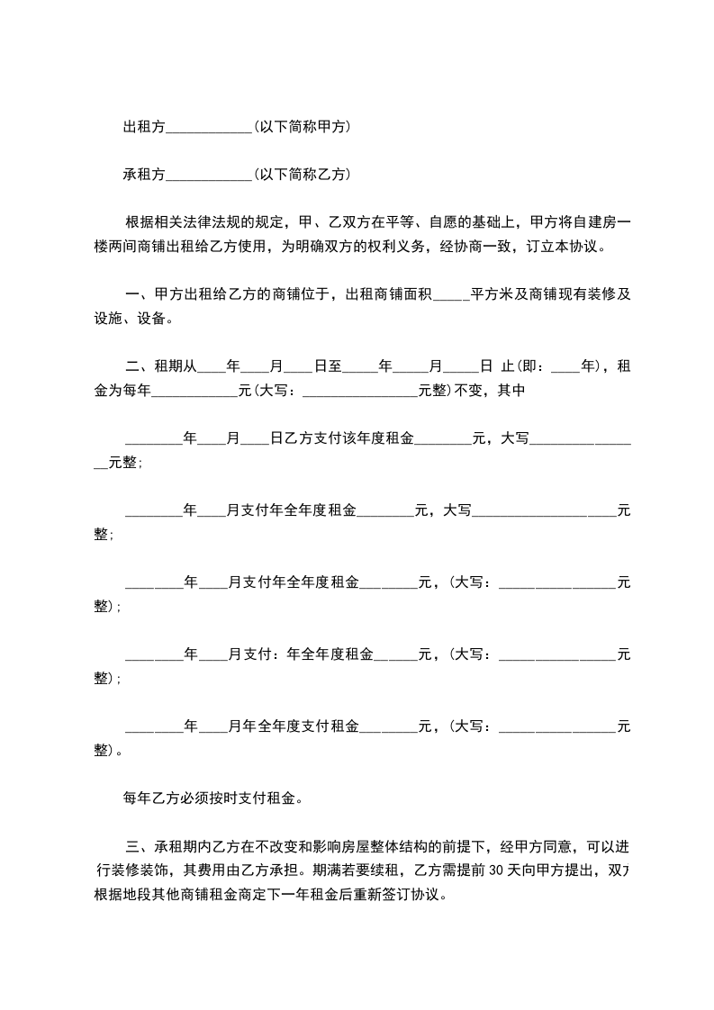 一:乙方租用甲方位于___________________________门面房一间,面积 ___ 平米左右(一层),用于___________________________,门面房内附属设施有____________________________________.