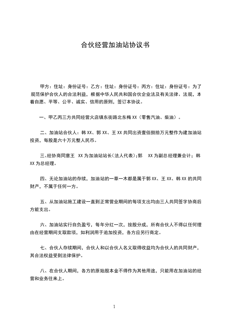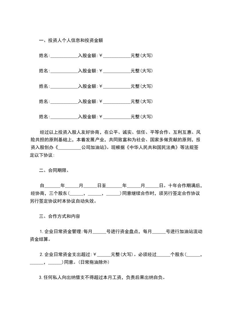 经过以上投资入股人友好协商,在公平、诚实、信任、平等合作、互利互惠、风险共担的原则基础上,本着发展产业,共同致富和为社会、国家多做贡献的原则,投资入股创办《__________公司加油站》。现根据《中华人民共和国民法典》等法规签定以下协议: