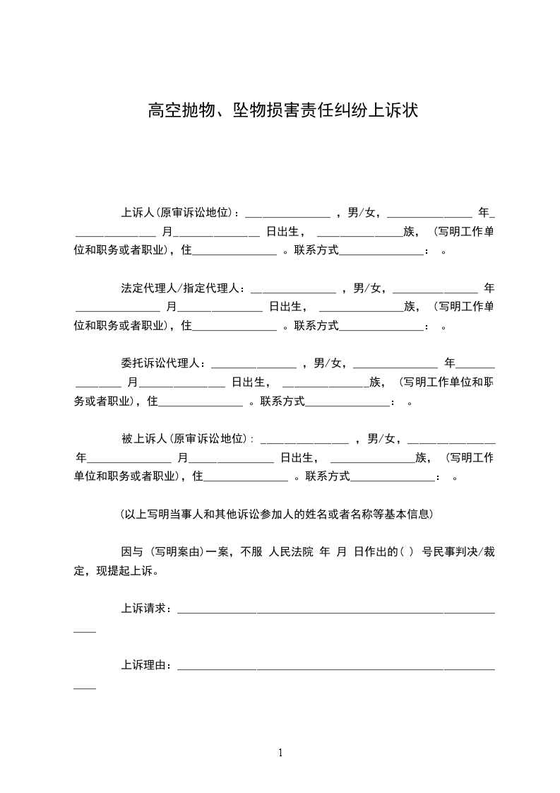 上诉状 上诉人:________________姓名、性别、出生年月、民族、文化程度、工作单位、职业、住址。(上诉人如为单位,应写明单位名称、法定代表人姓名及职务、单位地址)。