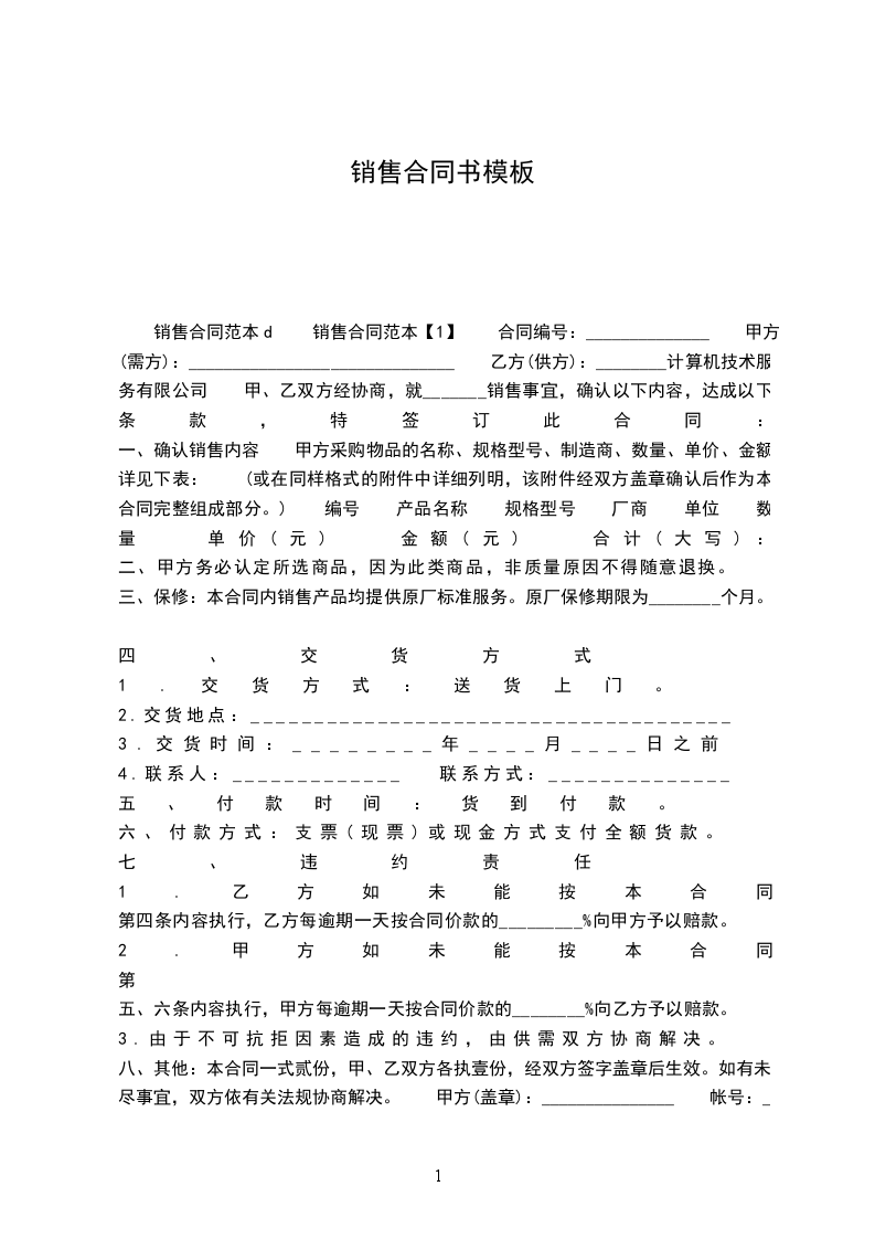 销售合同范本d 销售合同范本【1】 合同编号:______________ 甲方(需方):______________________________ 乙方(供方):________计算机技术服务有限公司 甲、乙双方经协商,就_______销售事宜,确认以下内容,达成以下条款,特签订此合同: