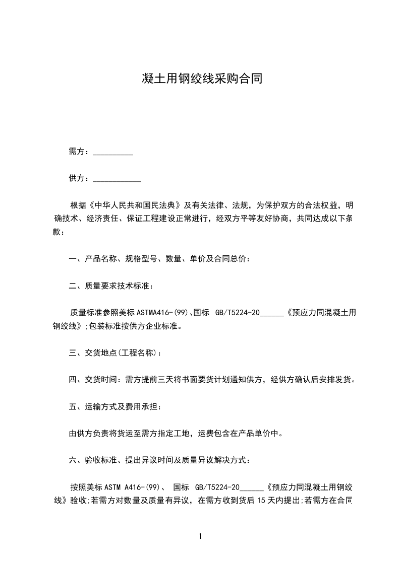 按照美标ASTM A416-(99)、 国标GB/T5224-20______《预应力同混凝土用钢绞线》验收;若需方对数量及质量有异议,在需方收到货后15天内提出;若需方在合同规定期限内对质量提出异议,双方无法达成共识,则双方共同派员取样送中国国家建筑钢材质量监督检验中心检测,双方将无条页认可该机构的检测结果,如属质量问题,由供方承担责任。