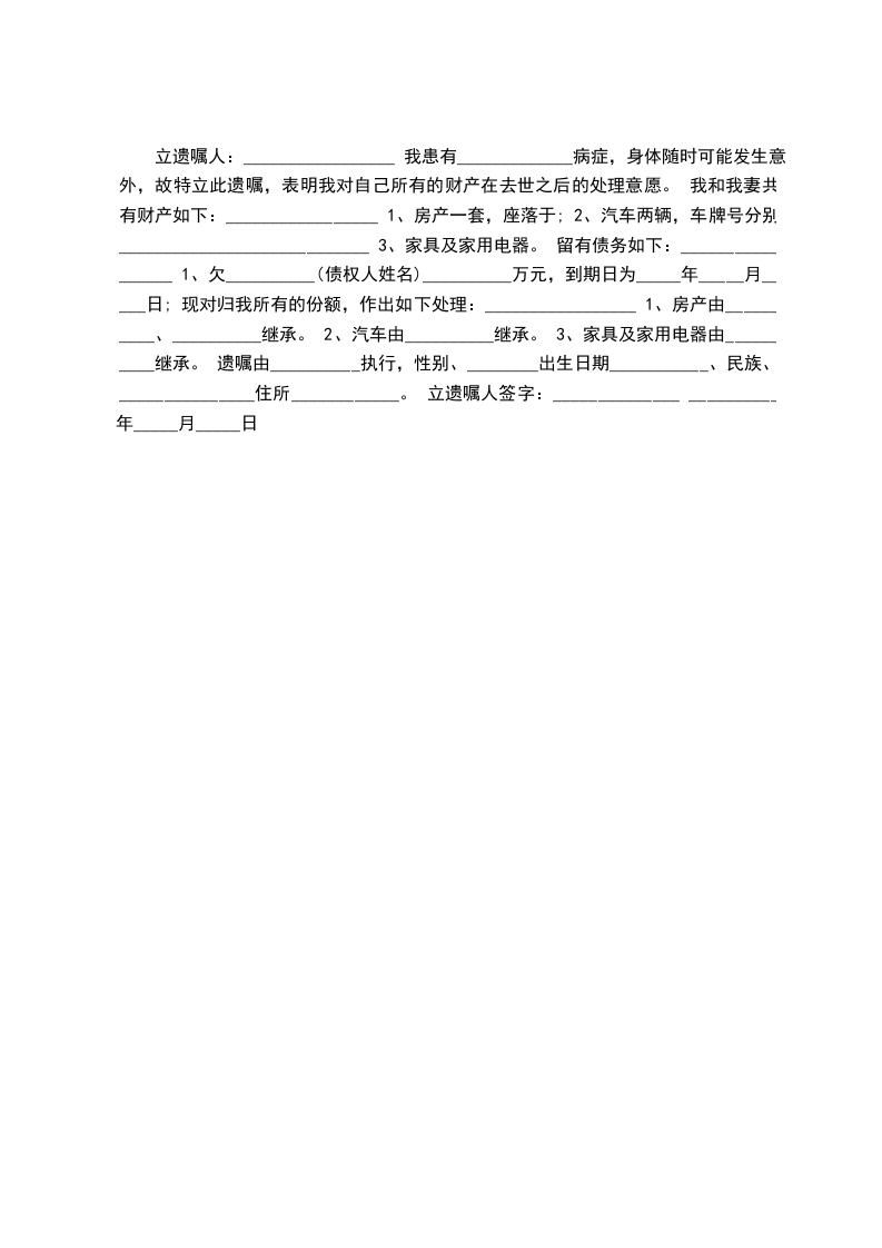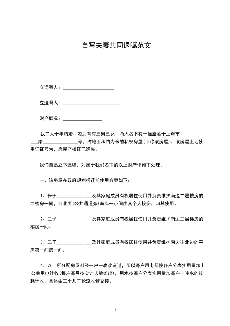 7、上述财产属于我们二人的合法共同财产,上述分配主张是我们的真实意思表示。本遗嘱是在我们神志清醒时自愿所立,其他人不得有异议。其他未尽事宜由夫妻双方协商增补。