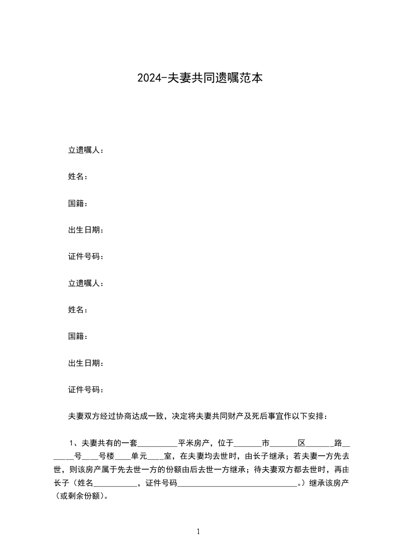 1、夫妻共有的一套__________平米房产,位于_______市_______区_______路_______号____号楼____单元____室,在夫妻均去世时,由长子继承;若夫妻一方先去世,则该房产属于先去世一方的份额由后去世一方继承;待夫妻双方都去世时,再由长子(姓名___________,证件号码______________________________。)继承该房产(或剩余份额)。