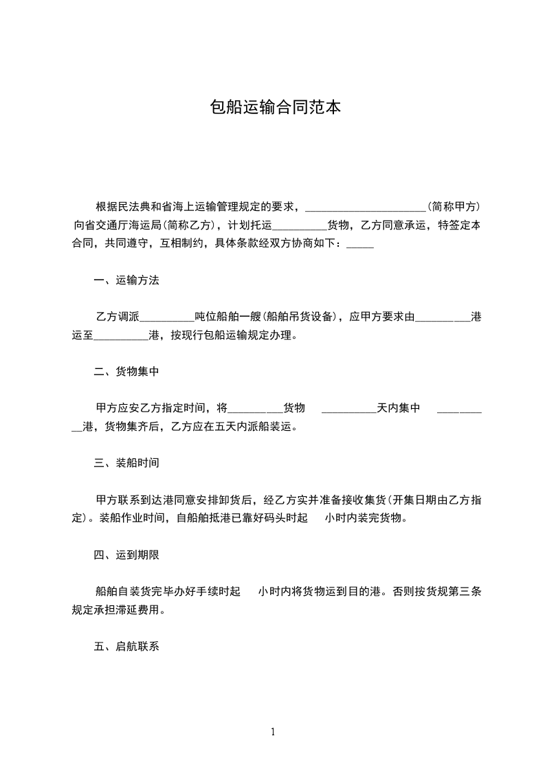 根据民法典和省海上运输管理规定的要求,______________________(简称甲方)向省交通厅海运局(简称乙方),计划托运__________货物,乙方同意承运,特签定本合同,共同遵守,互相制约,具体条款经双方协商如下:_____