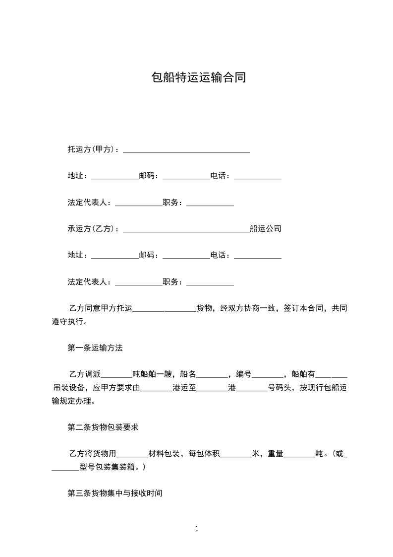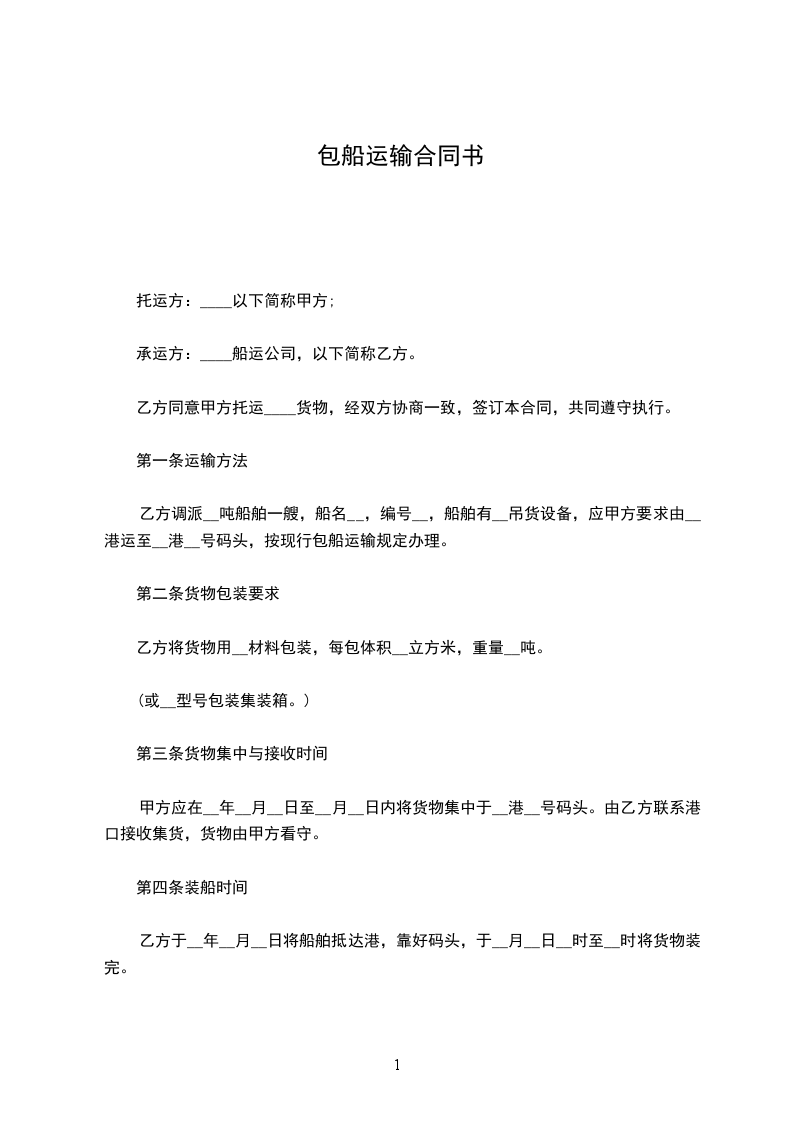 乙方调派__________吨位船舶一艘(船舶吊货设备),应甲方要求由__________港运至__________港,按现行包船运输规定办理。
