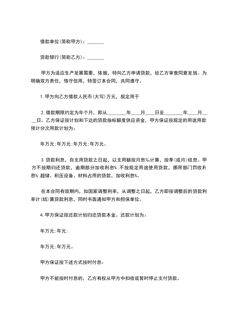 3.贷款利息,自支用贷款之日起,以支用额按月息‰计算,按季(或月)结息。甲方不按期归还贷款,逾期部分加收利息%;不按规定用途使用贷款,挪用部门罚收利息%;超储、积压设备、材料占用的贷款,加收利息%。