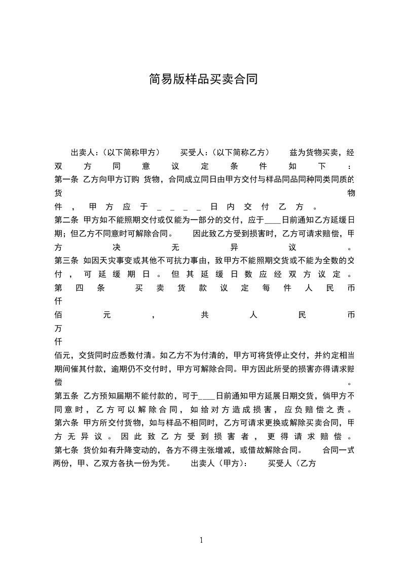 第一条 乙方向甲方订购 货物,合同成立同日由甲方交付与样品同品同种同类同质的货物