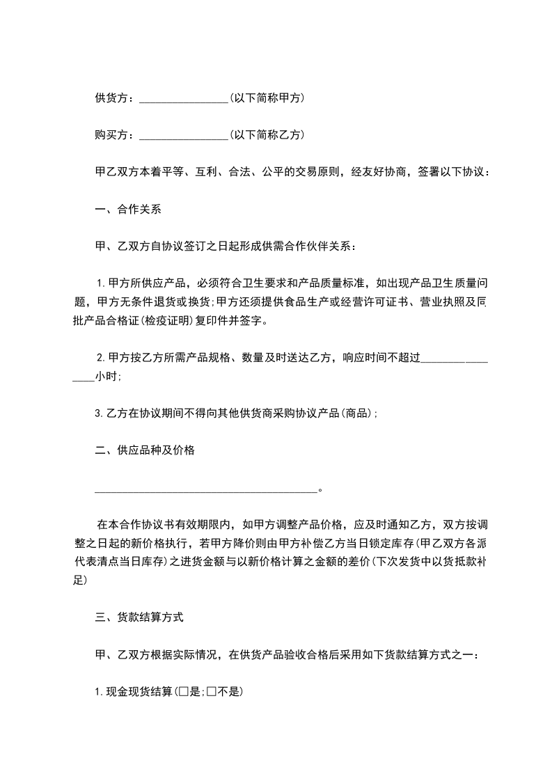 1、甲方须在 _______ 年_____ 月 ____日前交购货定金________ 万元,此款乙方在完成供货量后立即返还给甲方。