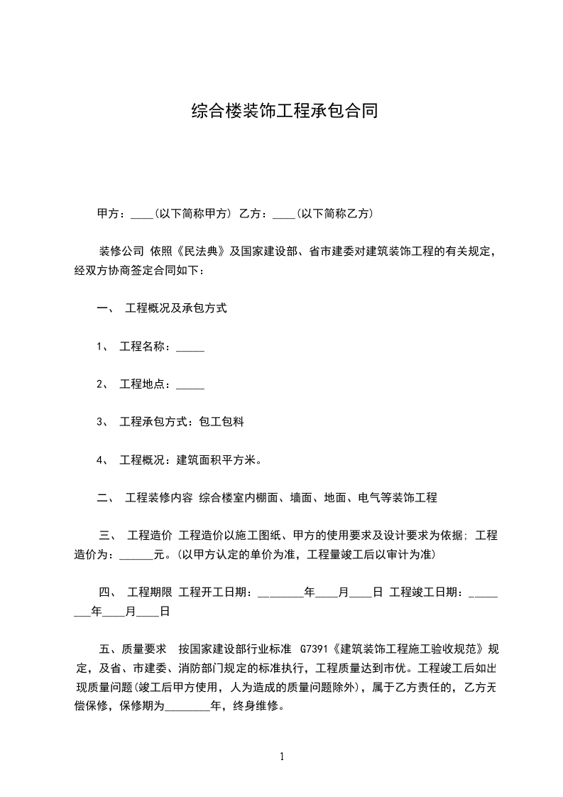 五、 质量要求 按国家建设部行业标准G7391《建筑装饰工程施工验收规范》规定,及省、市建委、消防部门规定的标准执行,工程质量达到市优。工程竣工后如出现质量问题(竣工后甲方使用,人为造成的质量问题除外),属于乙方责任的,乙方无偿保修,保修期为________年,终身维修。