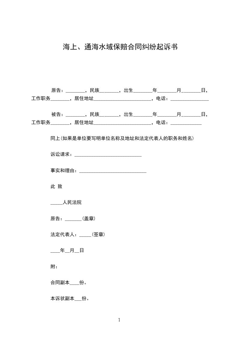 海上、通海水域保赔合同纠纷起诉书