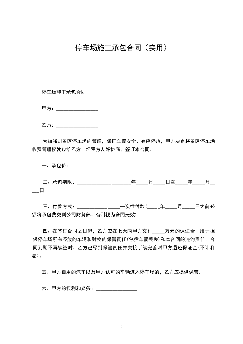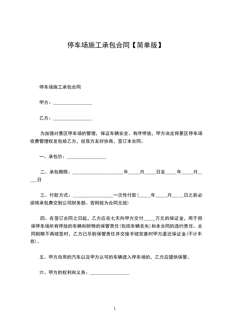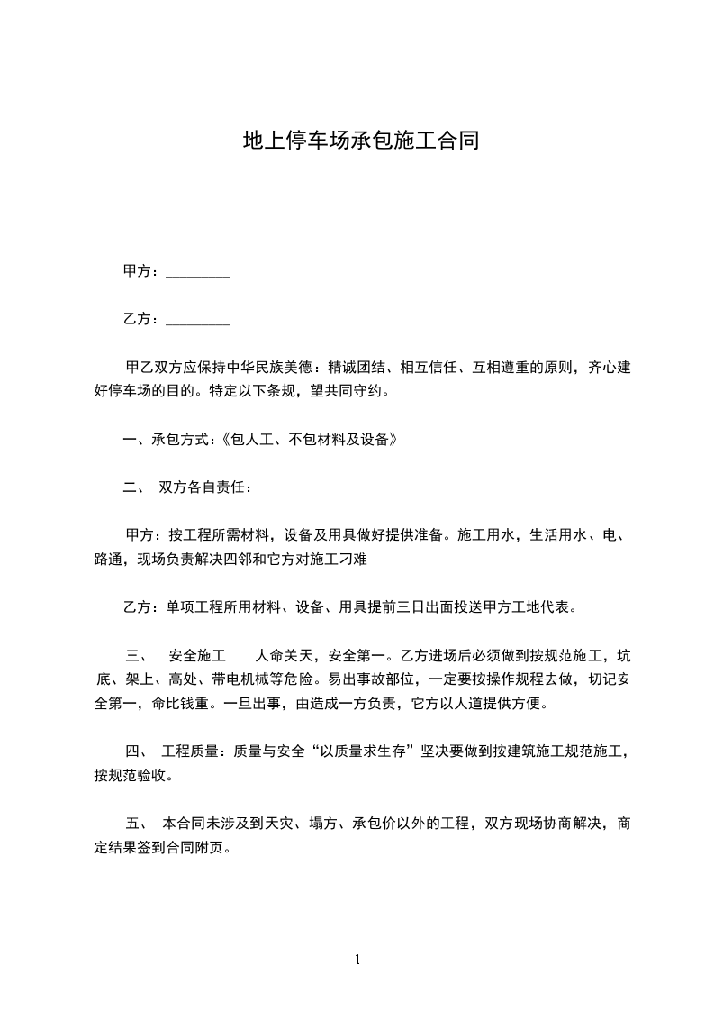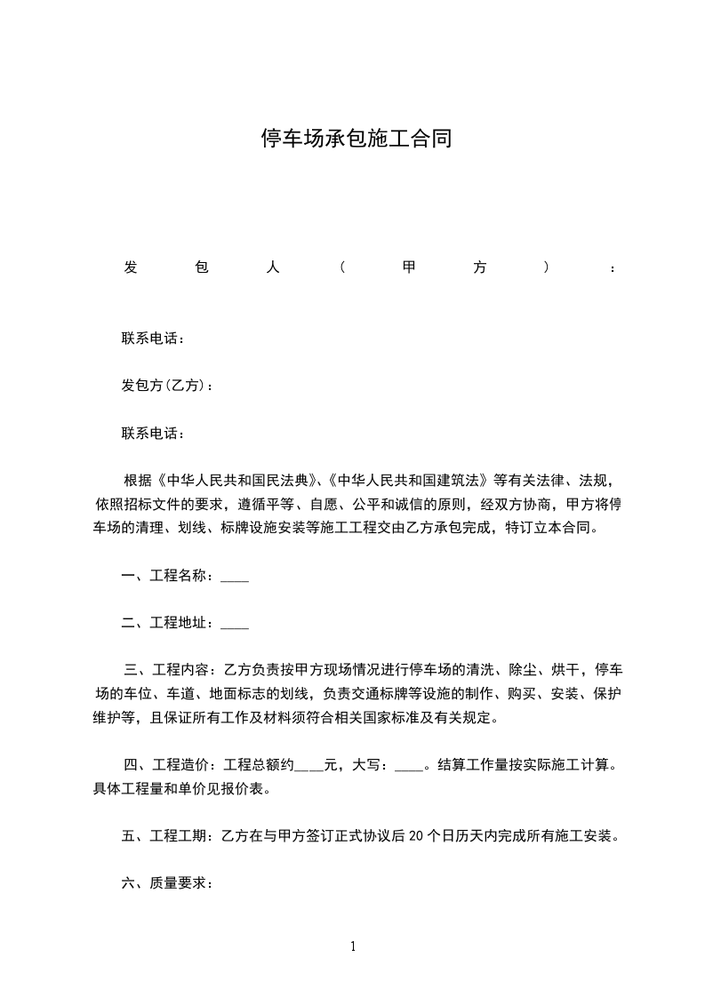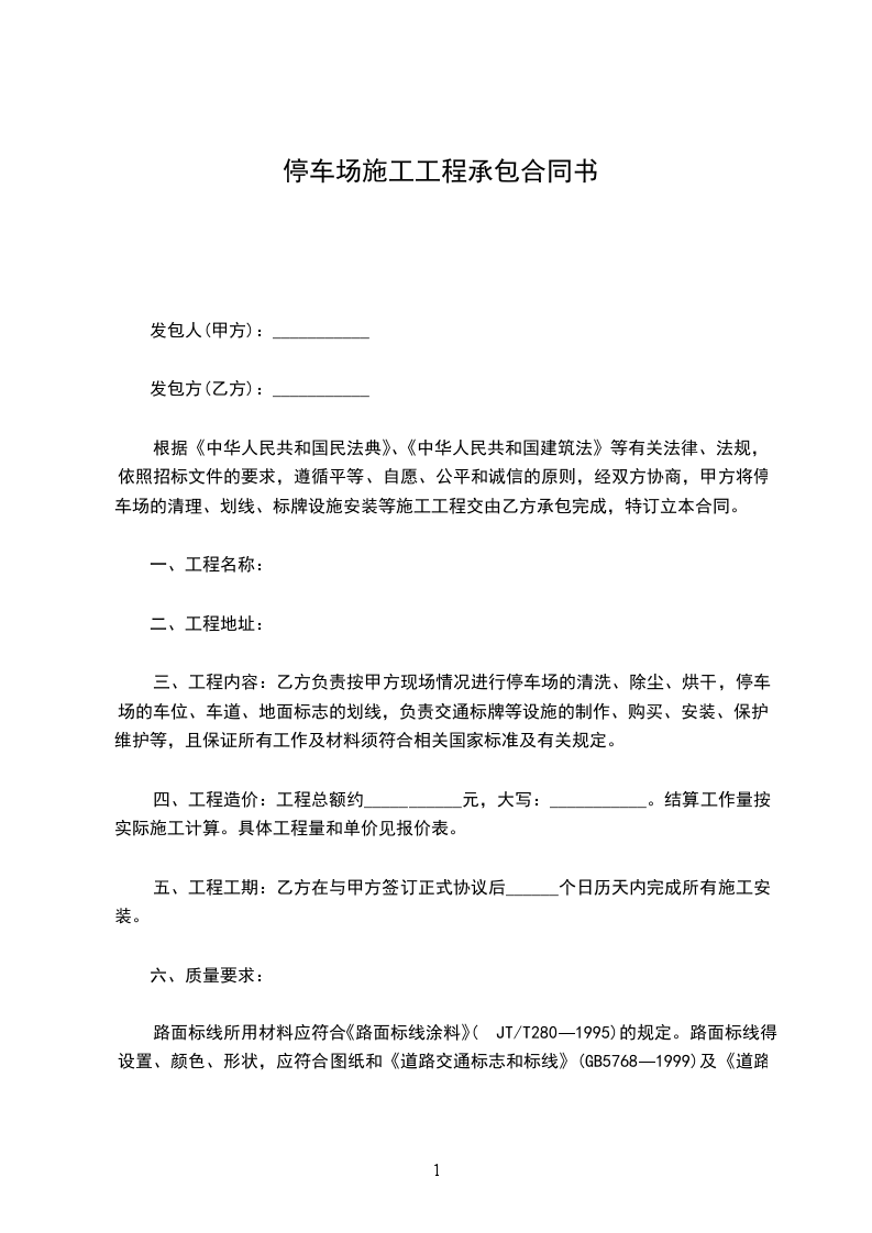 根据《中华人民共和国民法典》、《中华人民共和国建筑法》等有关法律、法规,依照招标文件的要求,遵循平等、自愿、公平和诚信的原则,经双方协商,甲方将停车场的清理、划线、标牌设施安装等施工工程交由乙方承包完成,特订立本合同。