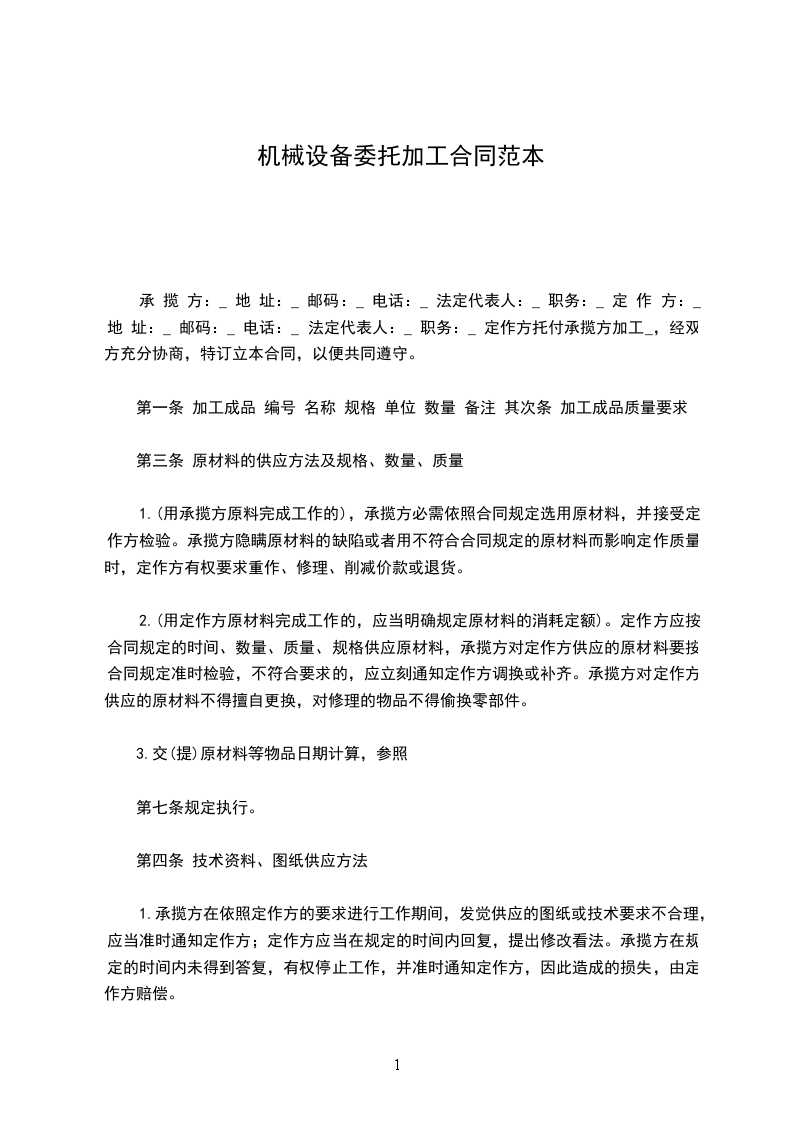 1、甲方自行采购的原材料、外购件及配套件,需按乙方的车间人员的要求集中堆放,其质量问题由甲方负责,如影响乙方装配,则应补偿有关人工费用。