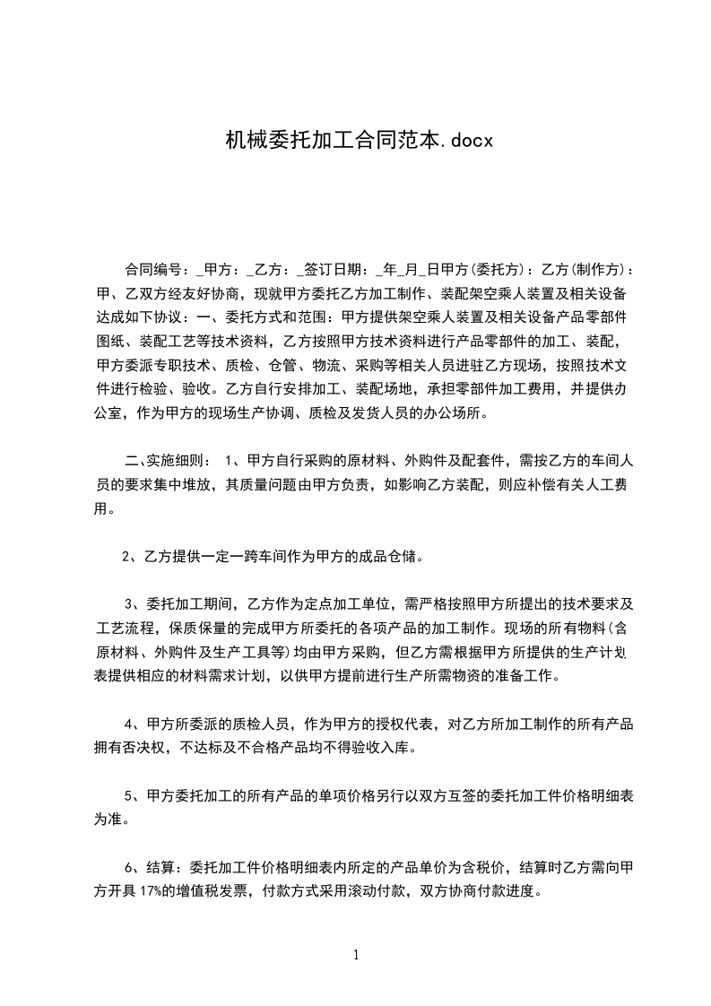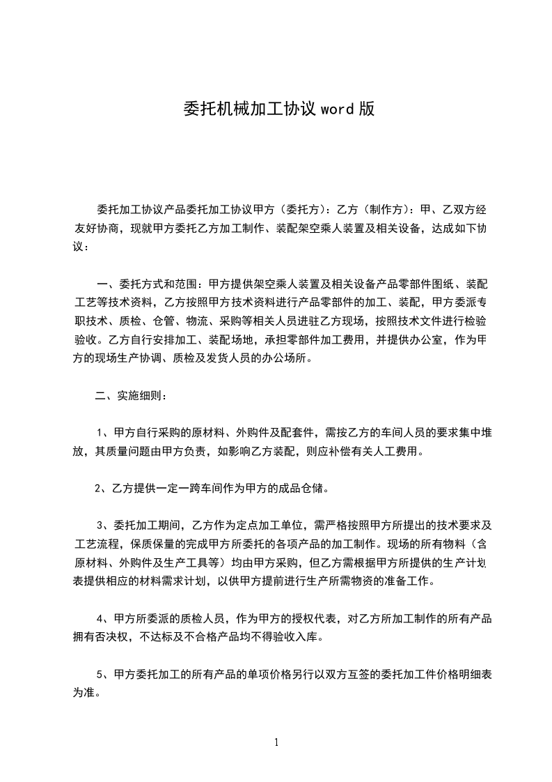 一、委托方式和范围:甲方提供架空乘人装置及相关设备产品零部件图纸、装配工艺等技术资料,乙方按照甲方技术资料进行产品零部件的加工、装配,甲方委派专职技术、质检、仓管、物流、采购等相关人员进驻乙方现场,按照技术文件进行检验、验收。乙方自行安排加工、装配场地,承担零部件加工费用,并提供办公室,作为甲方的现场生产协调、质检及发货人员的办公场所。