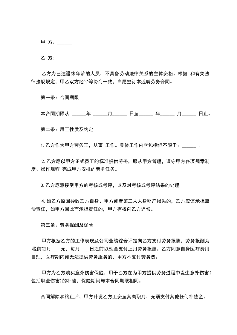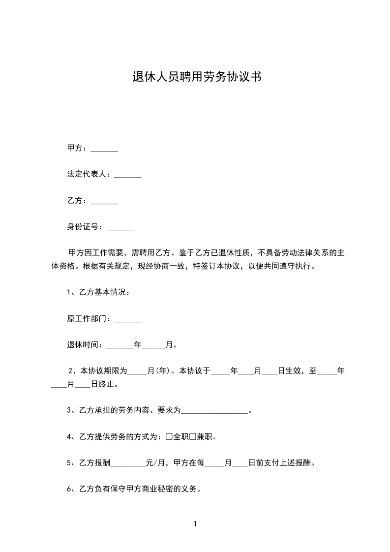 甲方因工作需要,需聘用乙方。鉴于乙方已退休性质,不具备劳动法律关系的主体资格。根据有关规定,现经协商一致,特签订本协议,以便共同遵守执行。