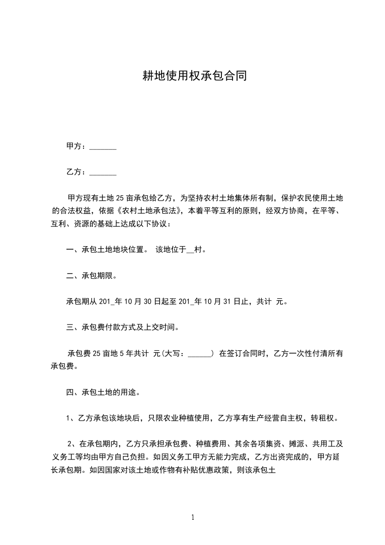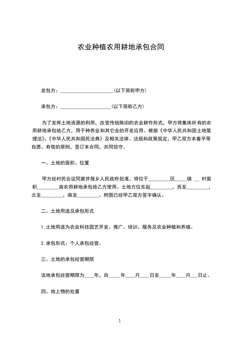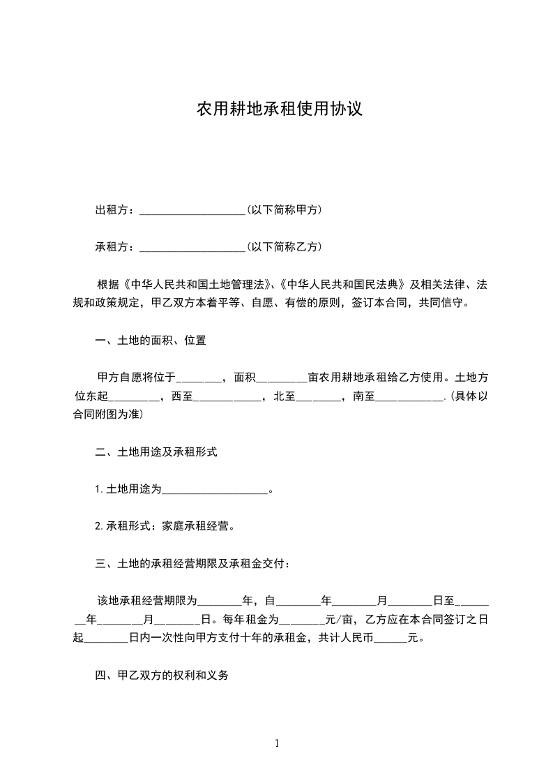 甲方自愿将位于________,面积_________亩农用耕地承租给乙方使用。土地方位东起_________,西至____________,北至________,南至____________.(具体以合同附图为准)
