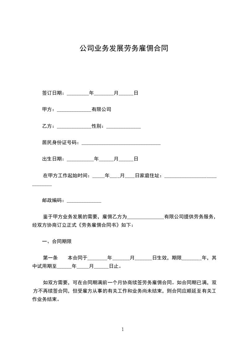鉴于甲方业务发展的需要,雇佣乙方为_______________有限公司提供劳务服务,经双方协商订立正式《劳务雇佣合同书》如下: