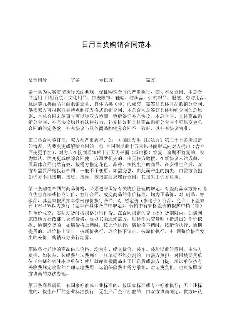 第一条为切实贯彻执行民法典规,保证购销合同的严肃执行,签订本总合同。本总合同适用 日用百货、文化用品、钟表眼镜、鞋帽、纺织品、针棉织品、服装、劳防用品、丝绸等九类商品商商购销业务。具体品类(种)的成交,需签订具体商品购销分合同。供需双方可根据自身特点制订表格式购销合同。本总合同是签订具体购销合同的总原则。本总合同未尽事宜可以经双方协商一致后签订补充协议。本总合同、具体商品购销分合同、补充协议均具有法律效力。补充协议和具体商品购销分合同不可以变更总合同的约定条款,补充协议与具体商品购销分合同不一致时,以补充协议为准。