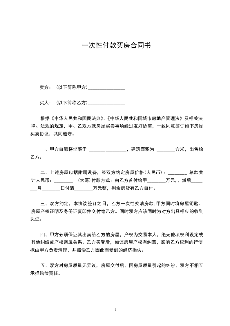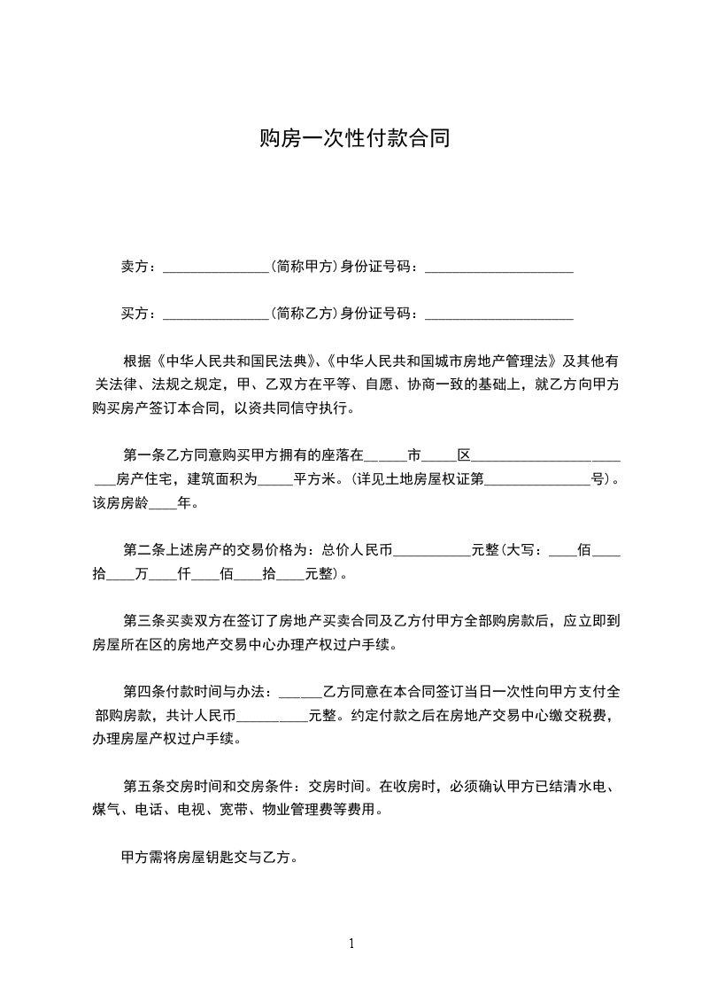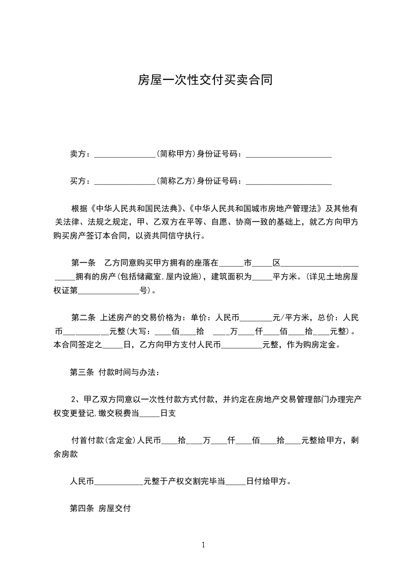 4.2本合同签订时乙方应将购房款一次性交付甲方,甲方同时向乙方交付房屋产权证、土地使用证及相关手续。