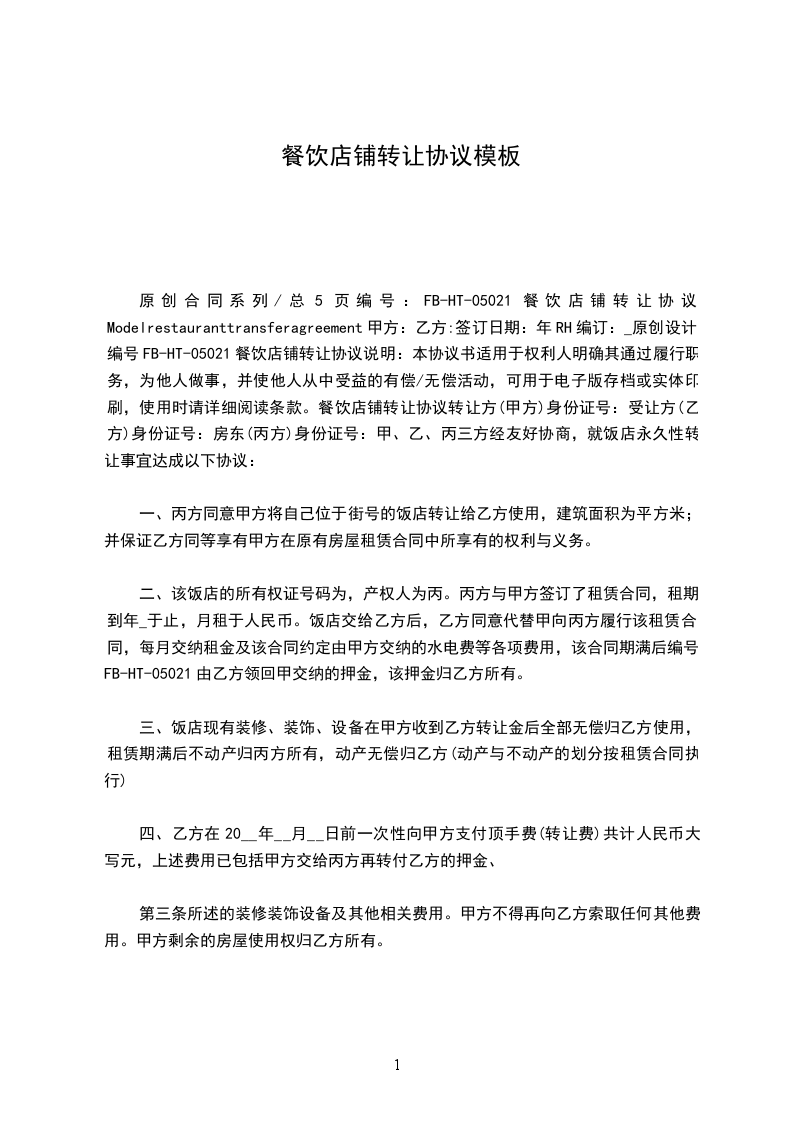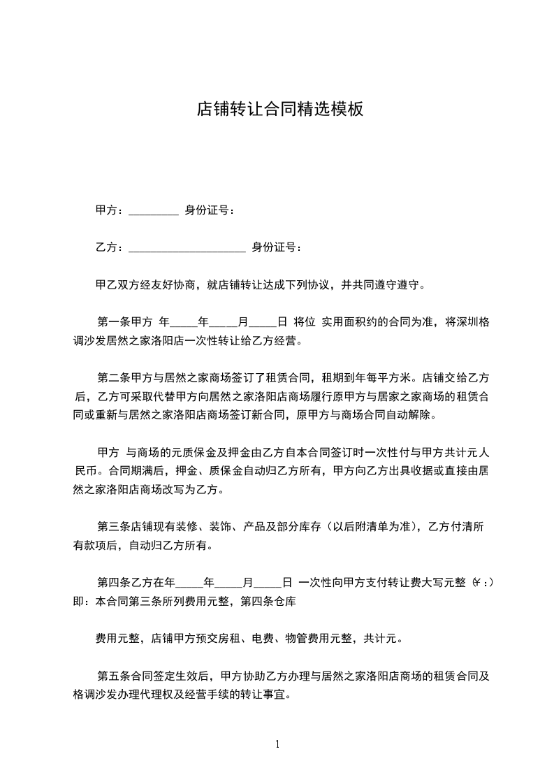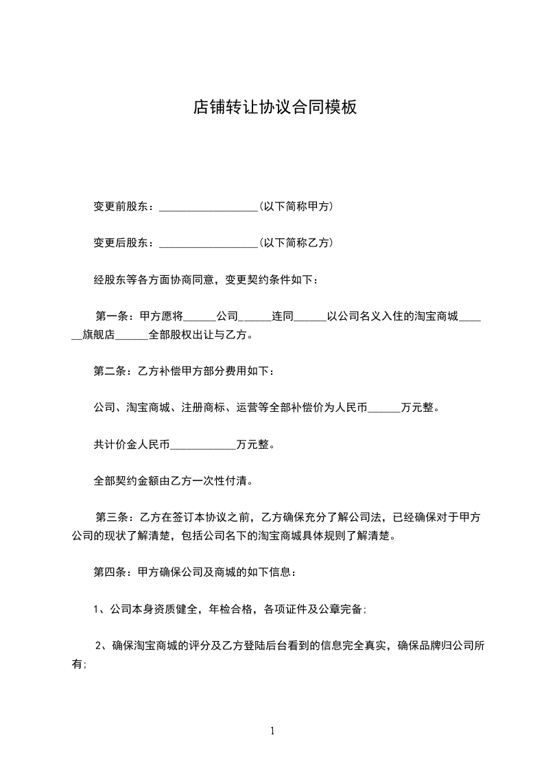 第一条甲方与_____年_____月_____日前将位 商铺{面积_____平方米}转让给乙方使用。