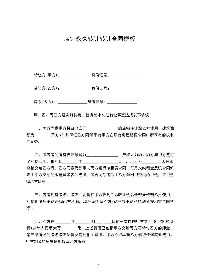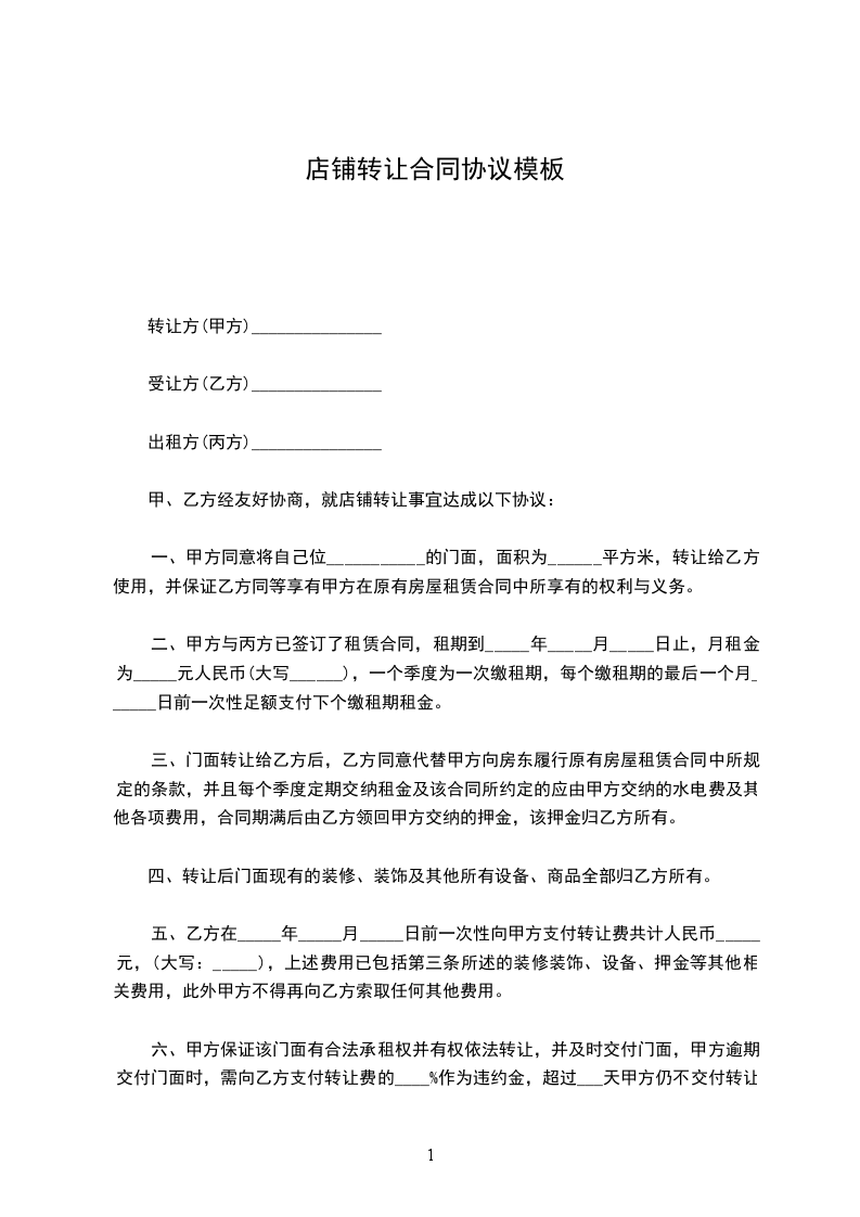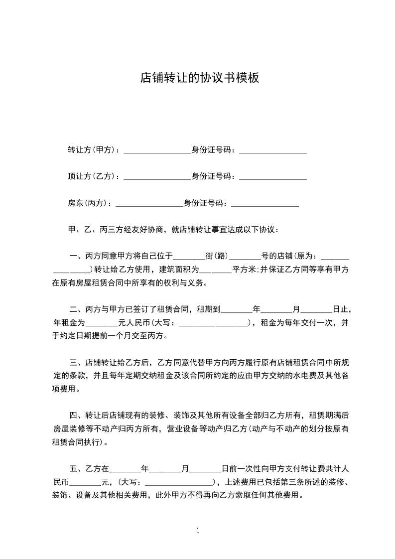 店铺转让协议书模板一转让方(甲方):_____身份证号码:__________顶让方(乙方):_____身份证号码:__________房东(丙方):_____身份证号码:__________甲、乙、丙三方经友好协商,就店铺转让事宜达成以下协议: