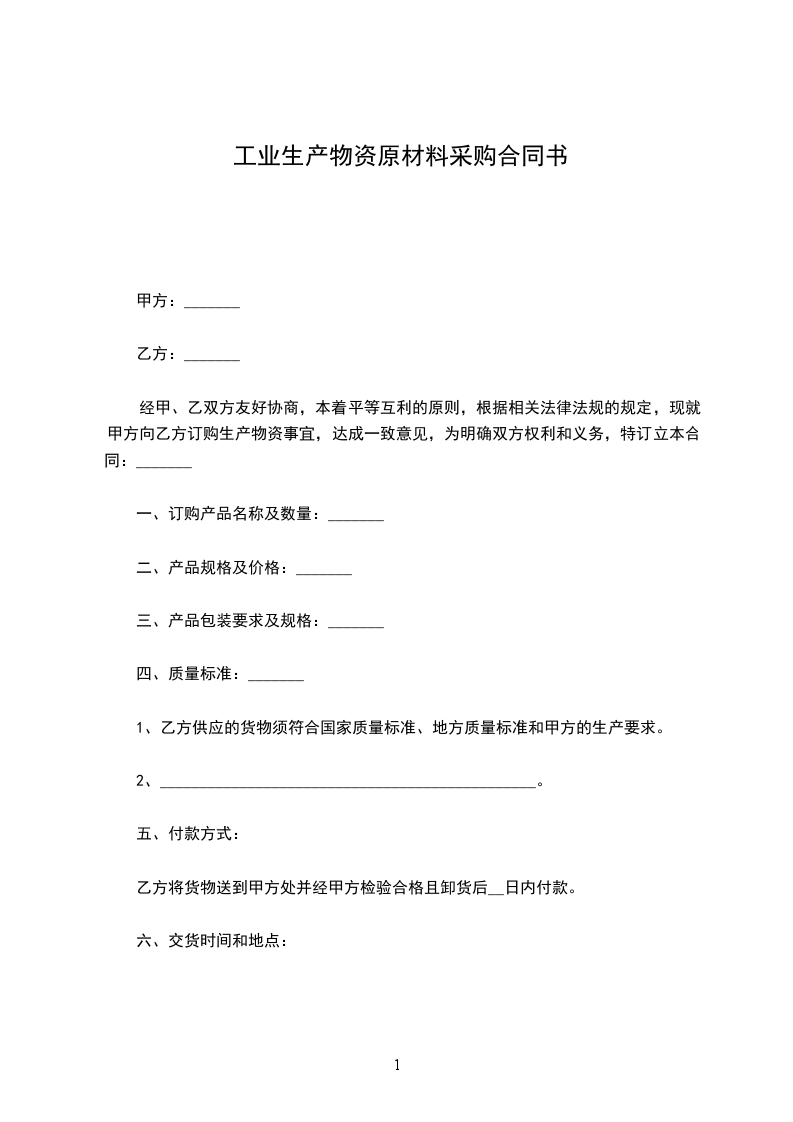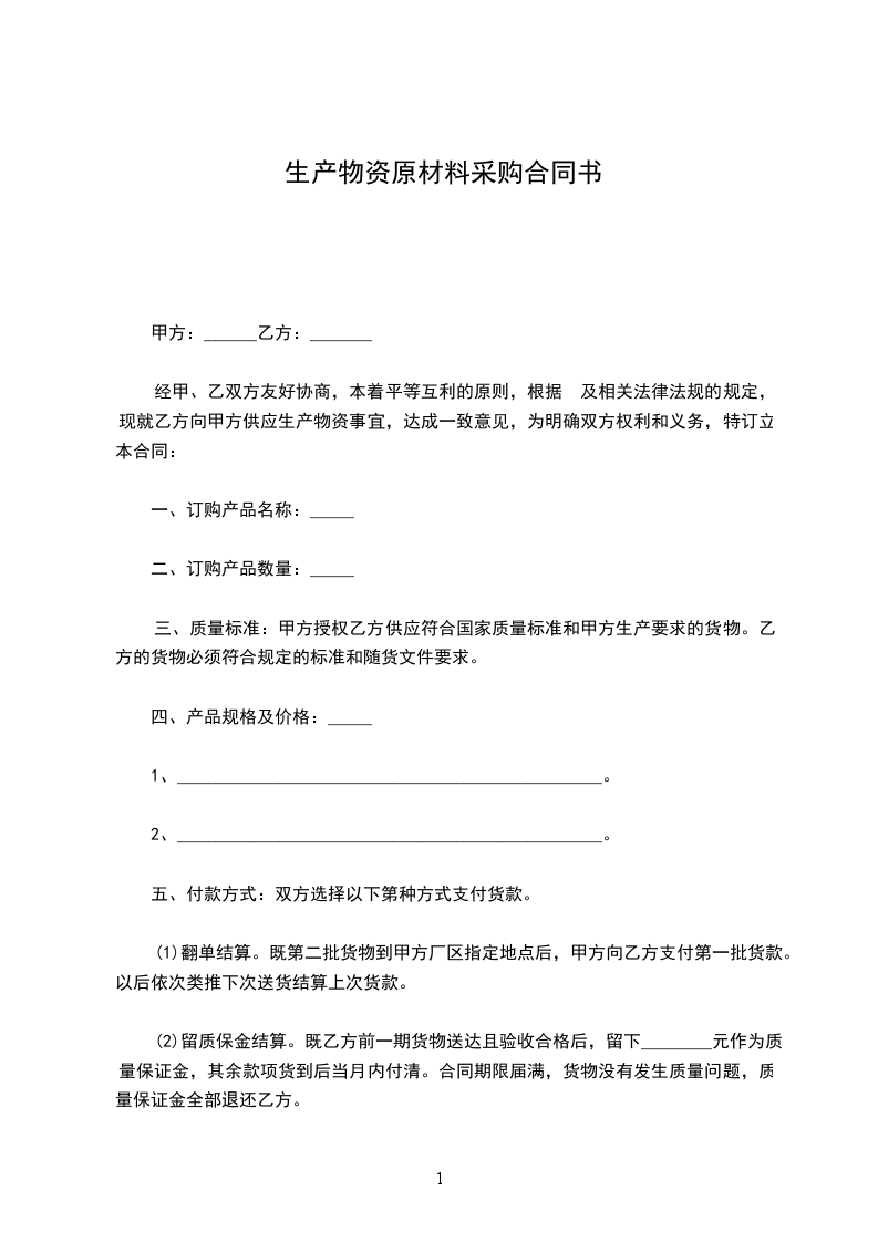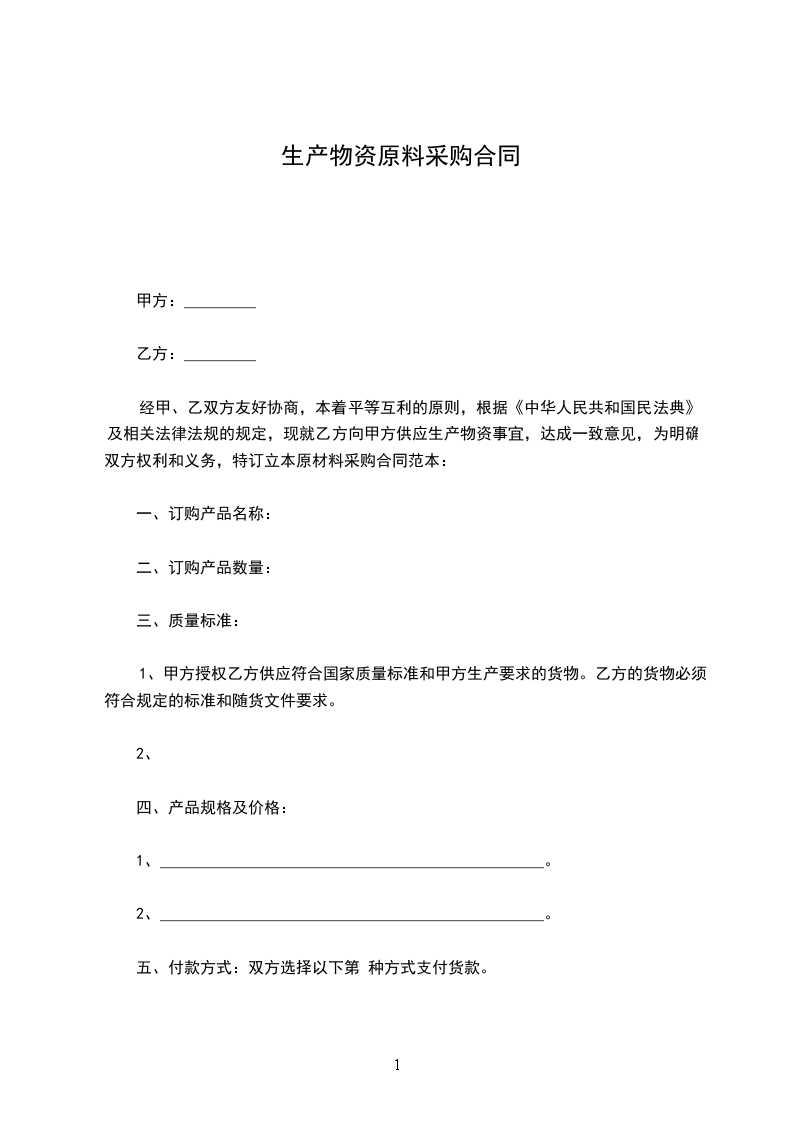经甲、乙双方友好协商,本着平等互利的原则,根据《中华人民共和国民法典》及相关法律法规的规定,现就甲方向乙方订购生产物资事宜,达成一致意见,为明确双方权利和义务,特订立本合同: