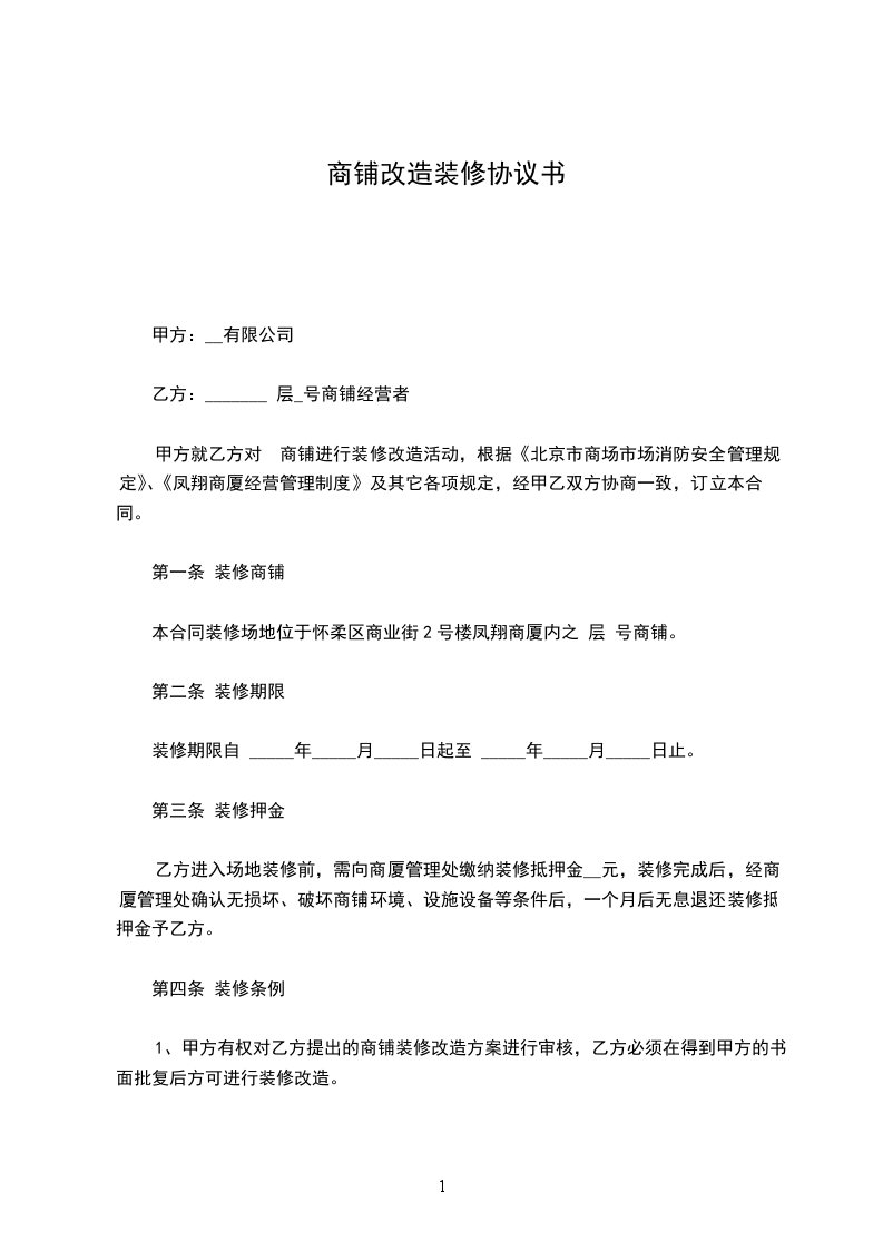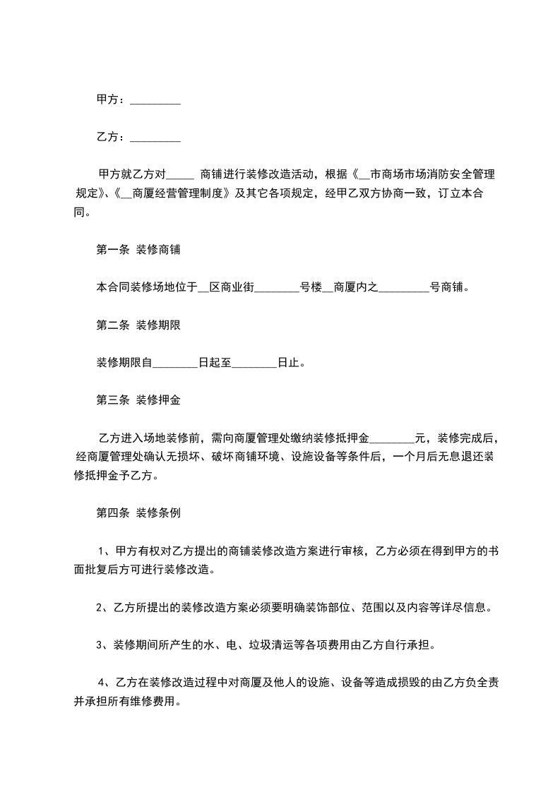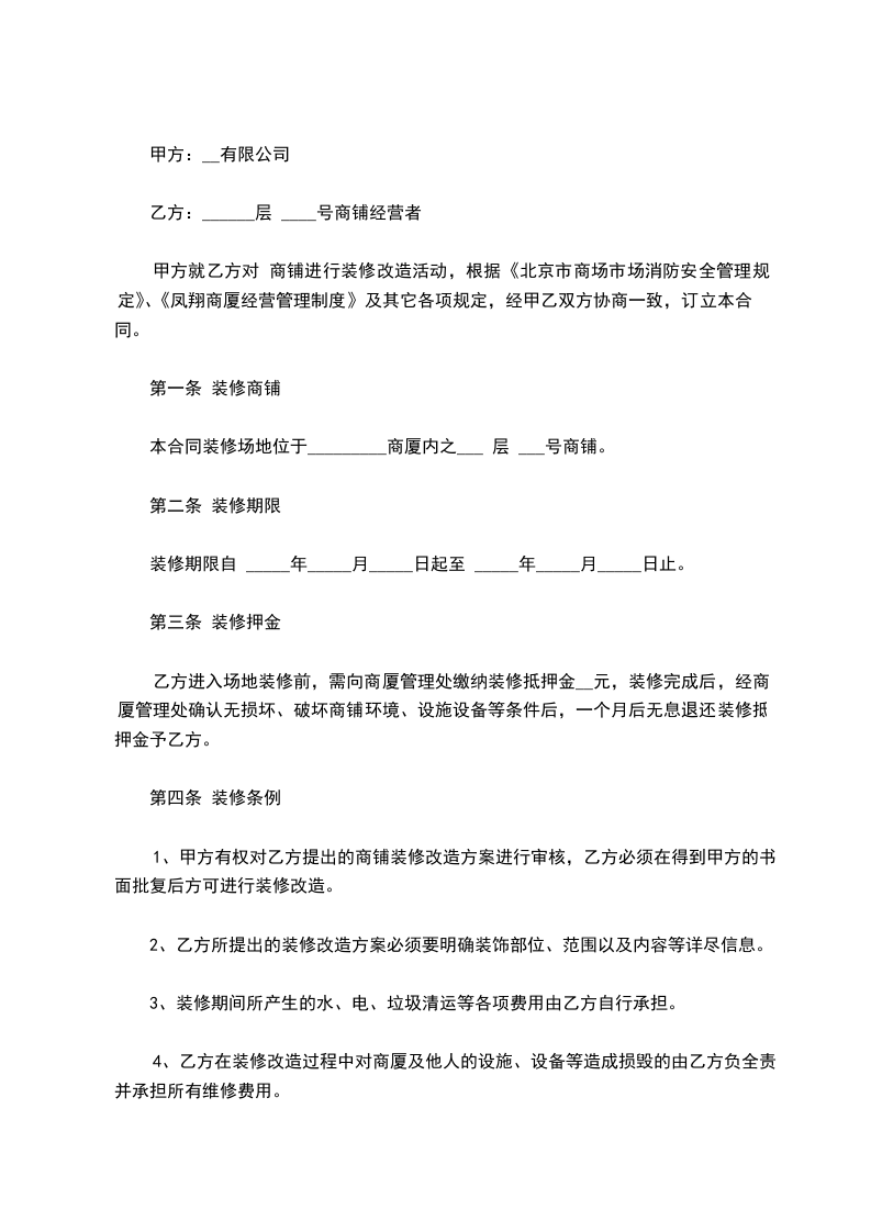 甲方就乙方对 商铺进行装修改造活动,根据《____市商场市场消防安全管理规定》、《凤翔商厦经营管理制度》及其它各项规定,经甲乙双方协商一致,订立本合同。