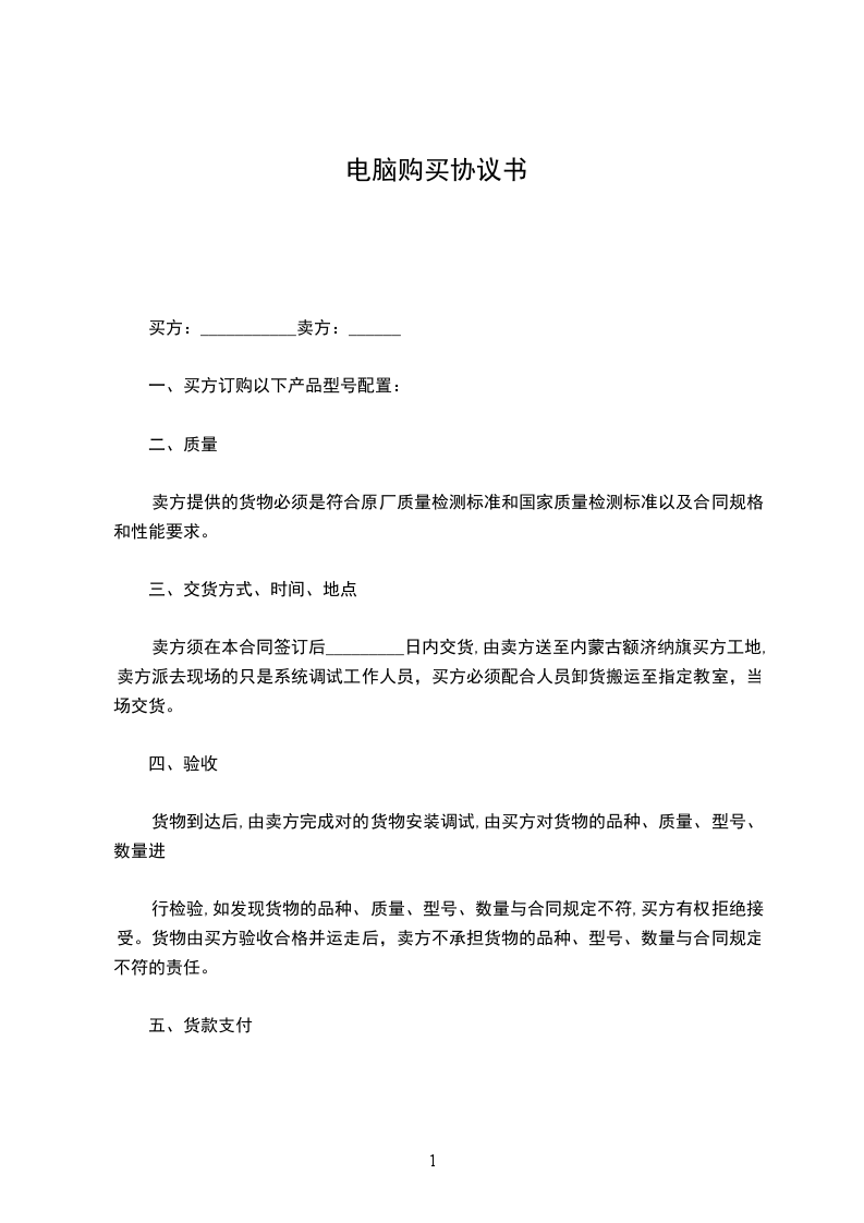 1、甲方向乙方定购的电脑,共计__台配置详见附牛:电脑设备配置单,单价为:__元(大写:__)总金额为:__元(大写:_)