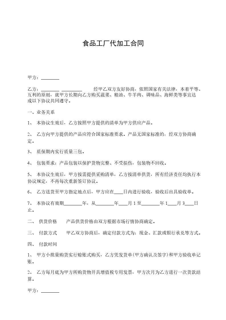 乙方:________ _________ 经甲乙双方友好协商,依照国家有关法律,本着平等、互利的原则,就甲方长期向乙方购买蔬菜、粮油、牛羊肉、调味品、海鲜类等事宜达成以下协议共同遵守。
