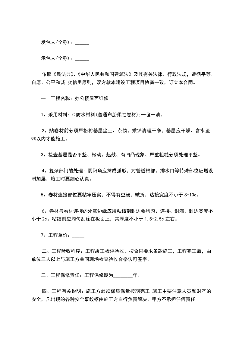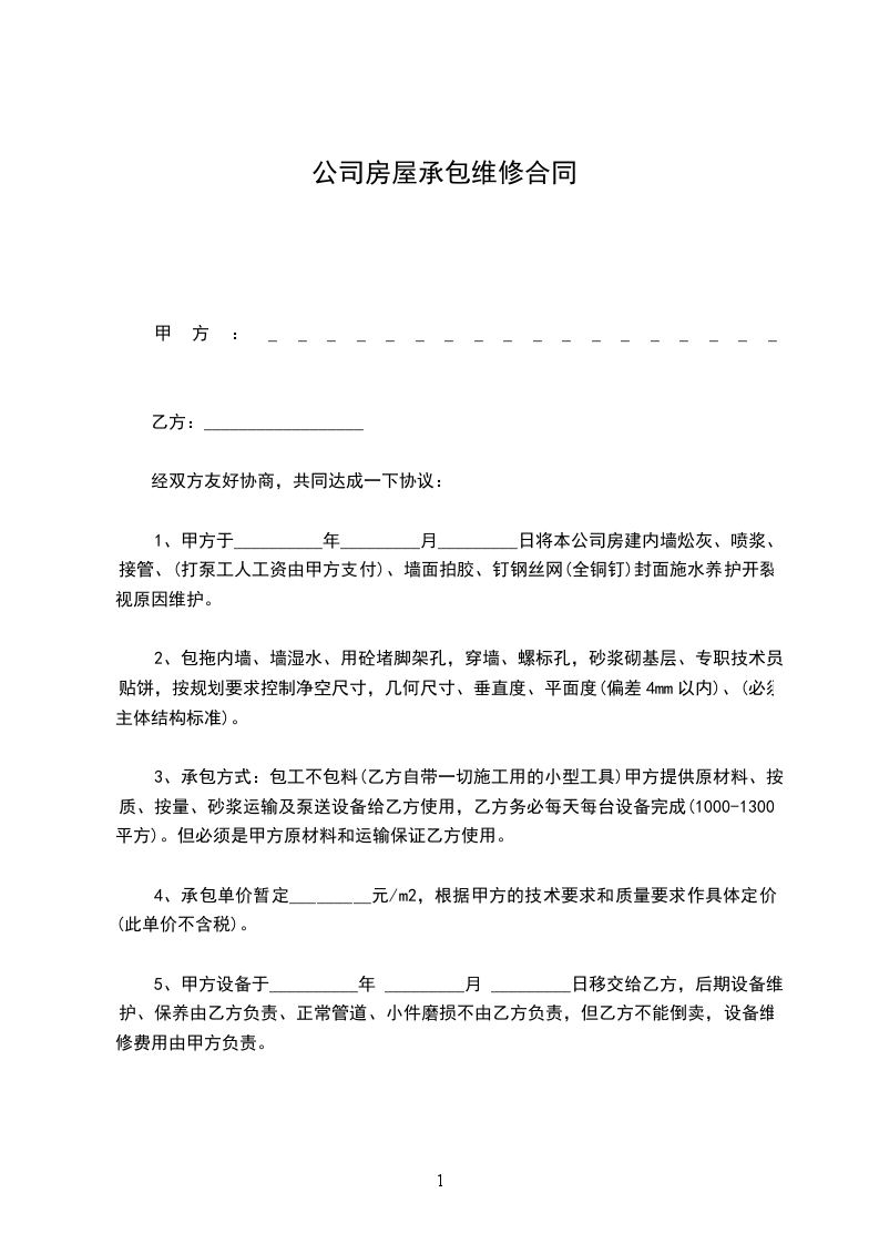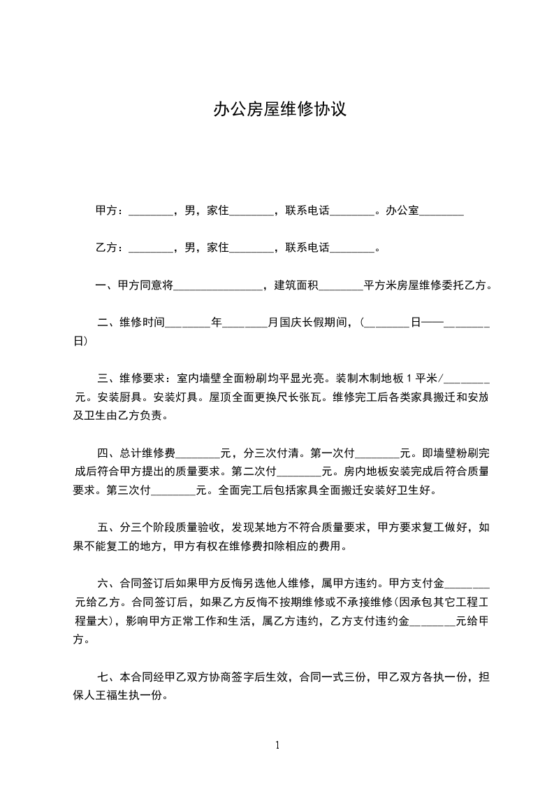 三、维修要求:室内墙壁全面粉刷均平显光亮。装制木制地板1平米/________元。安装厨具。安装灯具。屋顶全面更换尺长张瓦。维修完工后各类家具搬迁和安放及卫生由乙方负责。
