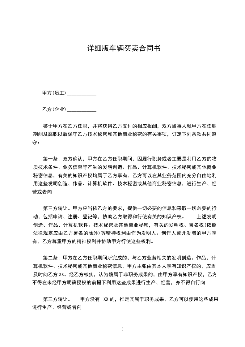 第一条:双方确认,甲方在乙方任职期间,因履行职务或者主要是利用乙方的物质技术条件、业务信息等产生的发明创造、作品、计算机软件、技术秘密或其他商业秘密信息,有关的知识产权均属于乙方享有。乙方可以在其业务范围内充分自由地利用这些发明创造、作品、计算机软件、技术秘密或其他商业秘密信息,进行生产、经营或者向