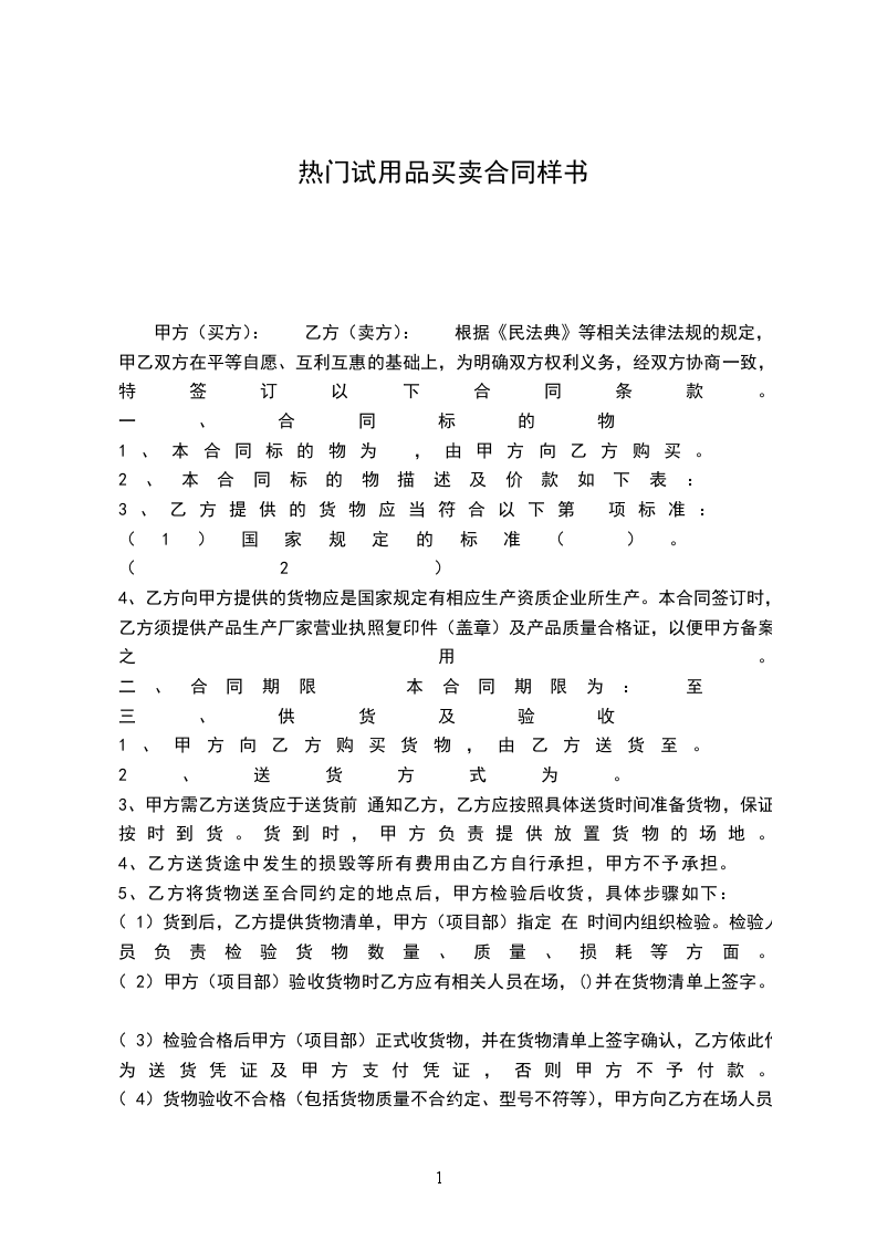 一、买卖标的和数量: 甲方将下列货物卖与乙方: 名 称 规格或型号 品 牌 生产商 数 量