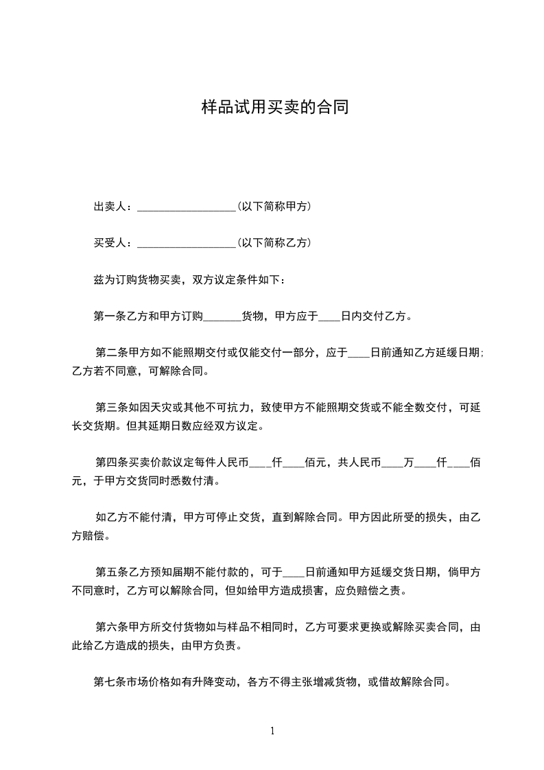 三、违约责任: 交货迟延的违约责任 验收迟延的违约责任:甲方交货日期得以顺延并由乙方承担损失风险,同时按日支付违约金 元; 货款支付迟延的违约责任; 交货不合格时的违约责任: 违反保密条款的违约责任:支付违约金 万元,但是如果违约方因违约而获得的利益或者守约方遭受的损失大于 万元时,上述款项应当如数赔偿给守约方 十