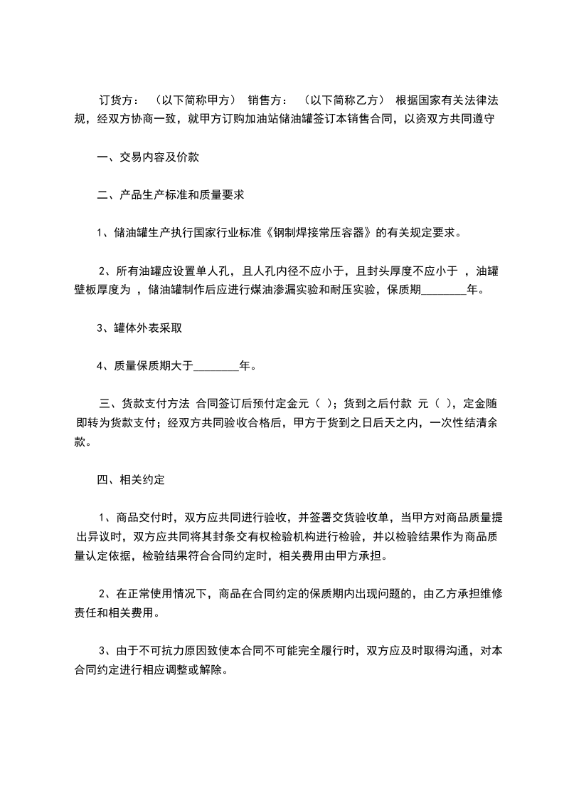 订货方: (以下简称甲方) 销售方: (以下简称乙方) 根据国家有关法律法规,经双方协商一致,就甲方订购加油站储油罐签订本销售合同,以资双方共同遵守: