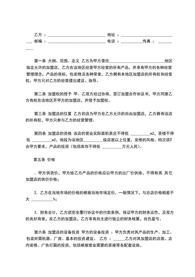 第四条 加盟店的资格 该店的营业实际面积茶庄不得低 __________m2,茶楼不得低 __________m2,地段为该地区__________级店面以上位置,装修的风格、档次须符合甲方要求,产品的投资(包括库存不得低 __________万元人民)。