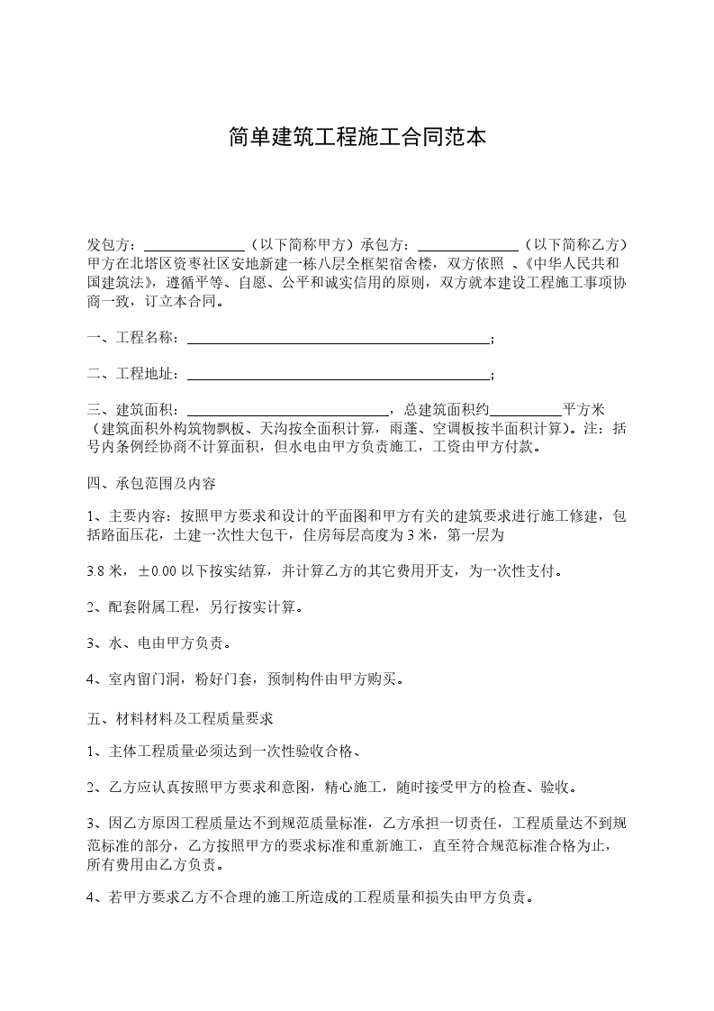 发包方:______________(以下简称甲方)承包方:______________(以下简称乙方)甲方在北塔区资枣社区安地新建一栋八层全框架宿舍楼,双方依照 、《中华人民共和国建筑法》,遵循平等、自愿、公平和诚实信用的原则,双方就本建设工程施工事项协商一致,订立本合同。