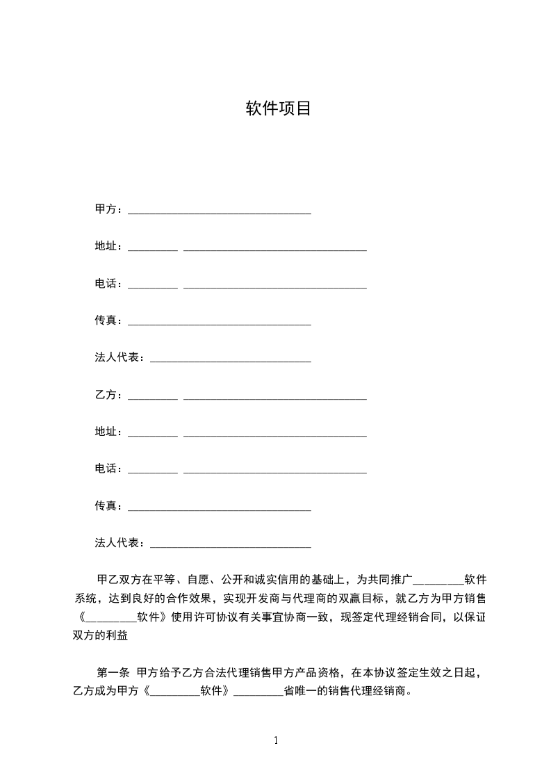 第一条 甲方给予乙方合法代理销售甲方产品资格,在本协议签定生效之日起,乙方成为甲方《_________软件》_________省唯一的销售代理经销商。