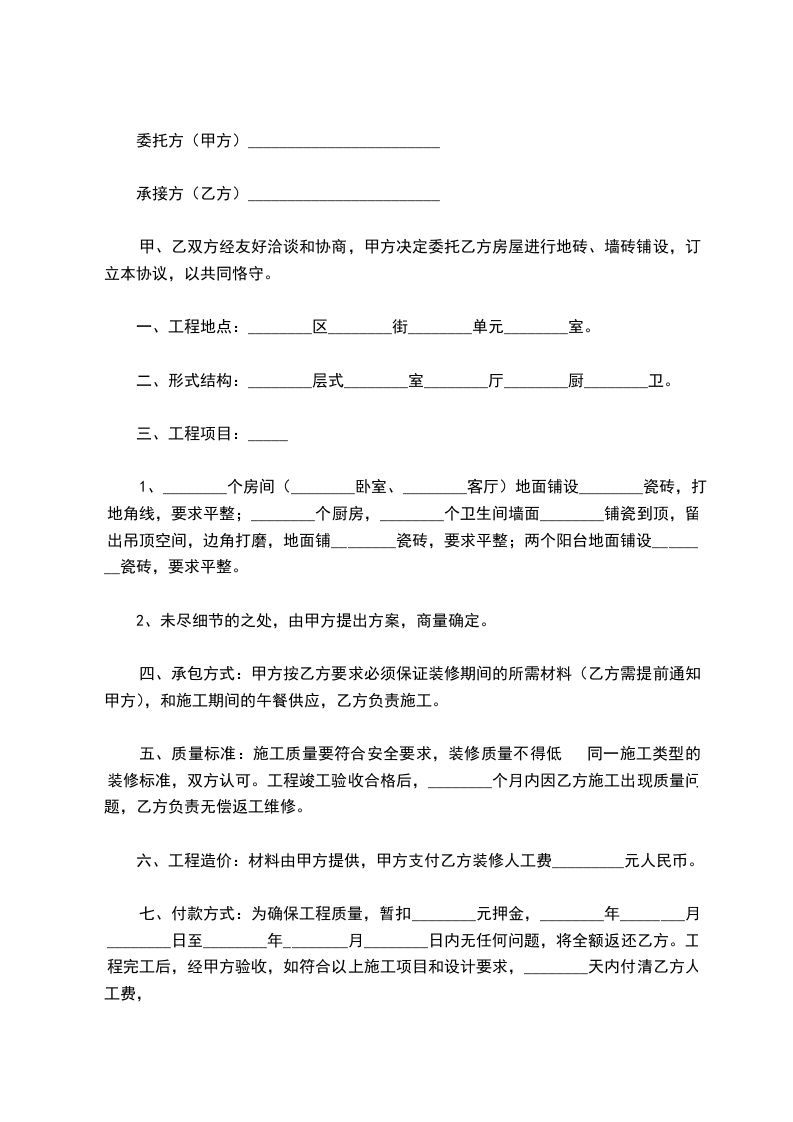 甲、乙双方经友好洽谈和协商,甲方决定委托乙方房屋进行地砖、墙砖铺设,订立本协议,以共同恪守。